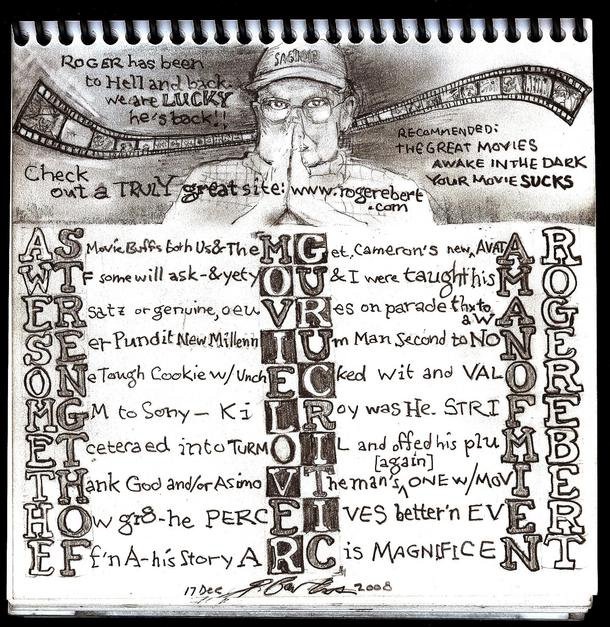 On Christmas Day, 2008, I sent a reply to Roger Ebert’s blog post that included a link to my sextuple-acrostic portrait of him. His reply, posted that Christmas night: Ebert: That manages to be touching and amusing at the same time. And awfully ingenious! Thank you. Since then he’s sent me a shiny new dime (long story) and declared me Second Place Winner in his Great Limerick Contest, awarding me a print of an Edward Lear etching and a copy of Lear’s The Owl and the Pussy-Cat. Now he declares via his Facebook presence: I’m aving a lot of health troubles that are keeping me from doing work and functioning online. Best person to contact is Chaz. Not in best of shape. So he is on my mind. The poor guy has been to Hell and back more than once (see my page); but his spirit is gigantic. I hope he does more than just get by this latest quality-of-life sandbar–I hope he makes it to tranquil coves.