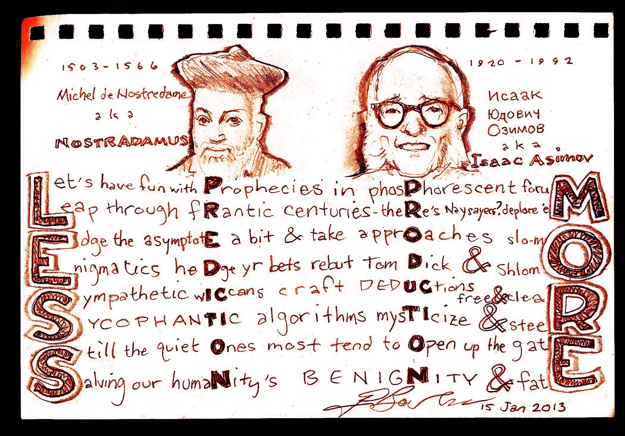 The 16th-Century apothecary and prognosticator Michel de Nostredame, popularly known as Nostradamus, is most likely better-known than the 20th-century biochemist, raconteur, limericist, Futurian, essayist, humorist, correspondent, toastmaster, and, yes, prognosticator, Isaac Asimov. Dr. Asimov is perhaps best known for his Foundation series, which covered more than a thousand years of Galactic history. But he also wrote Asimov’s Guide to Science, Asimov’s Guide to Shakespeare, Asimov’s Guide to the Bible, and about four hundred other books that made him the only author to have original writing in every single major Dewey Decimal System classification in the library. His daily writing streak extended from his teens till close to the end of his death at 72. In addition to his books, he corresponded with EVERYONE who wrote him–over one hundred THOUSAND letters.
