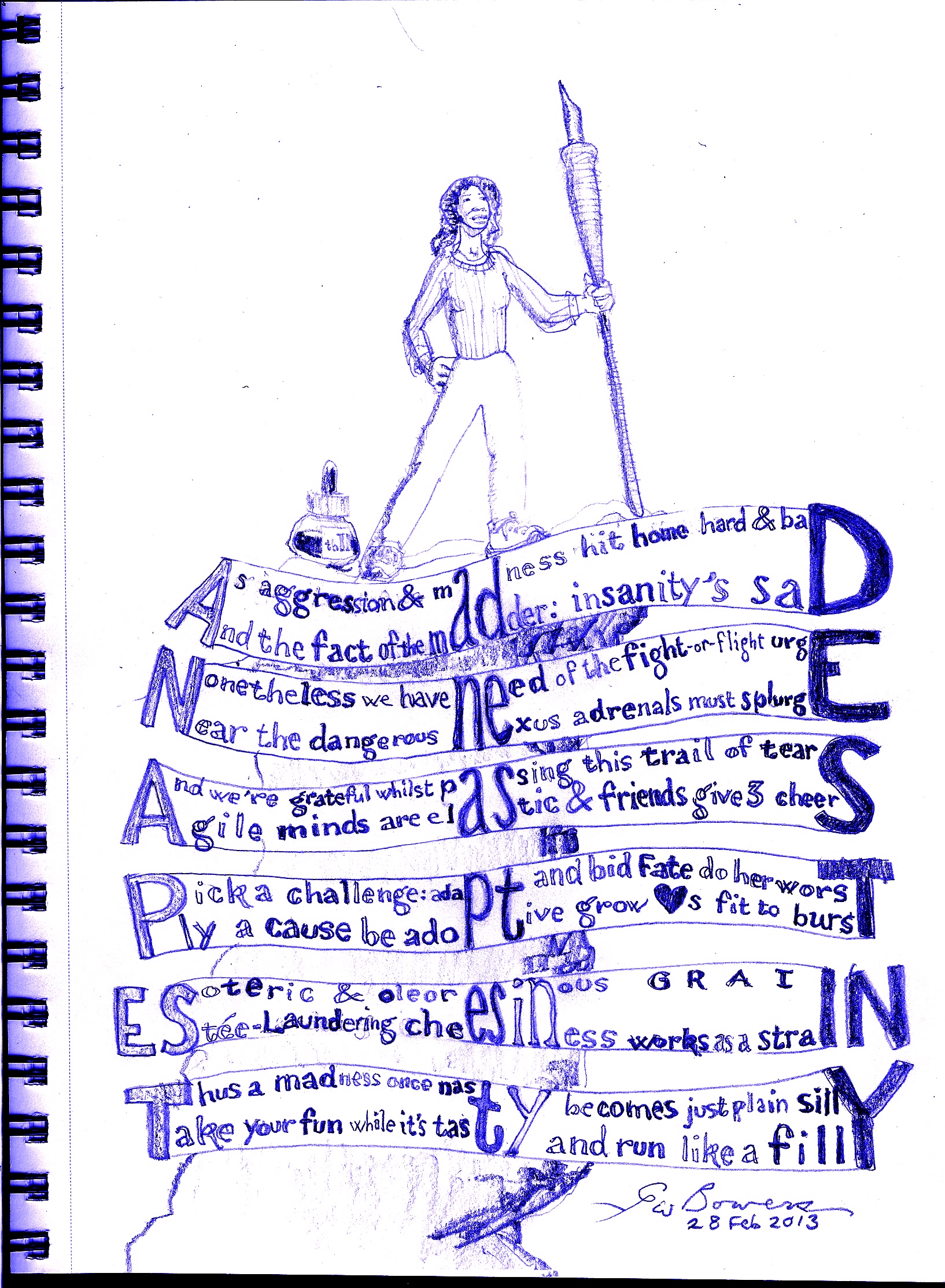 The acrostic is a riff on “Manifest Destiny,” a philosophy akin to “Conquer we must/If our cause it is just.” I think Manifest Destiny has had its day, and needs to not eat it too. I like Anapest Destiny a lot better: let us strive to be Poets.