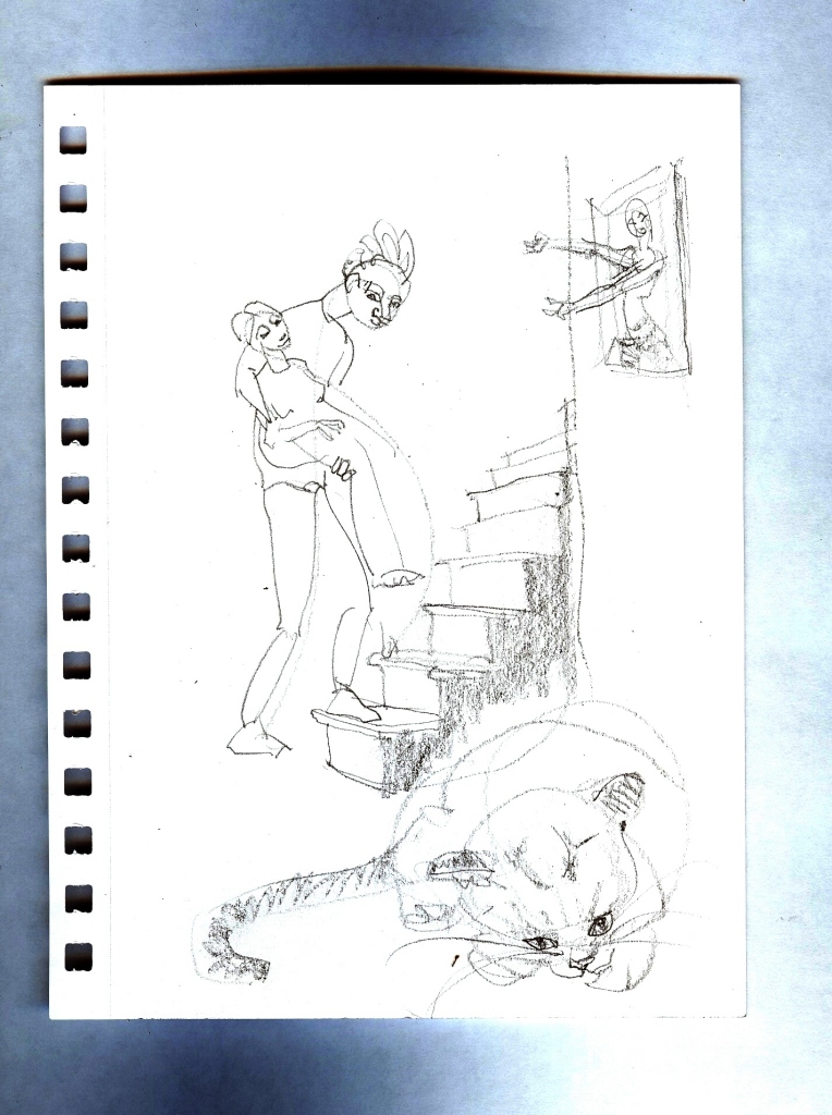 Most of these sketches are exemplary of the way one of my pages gets started. I just think out loud on paper (that isn’t loud at all, is it?), and sometimes the magic works, and sometimes it doesn’t. (Note the drawing problem of the fellow starting up the stairs, for instance.)