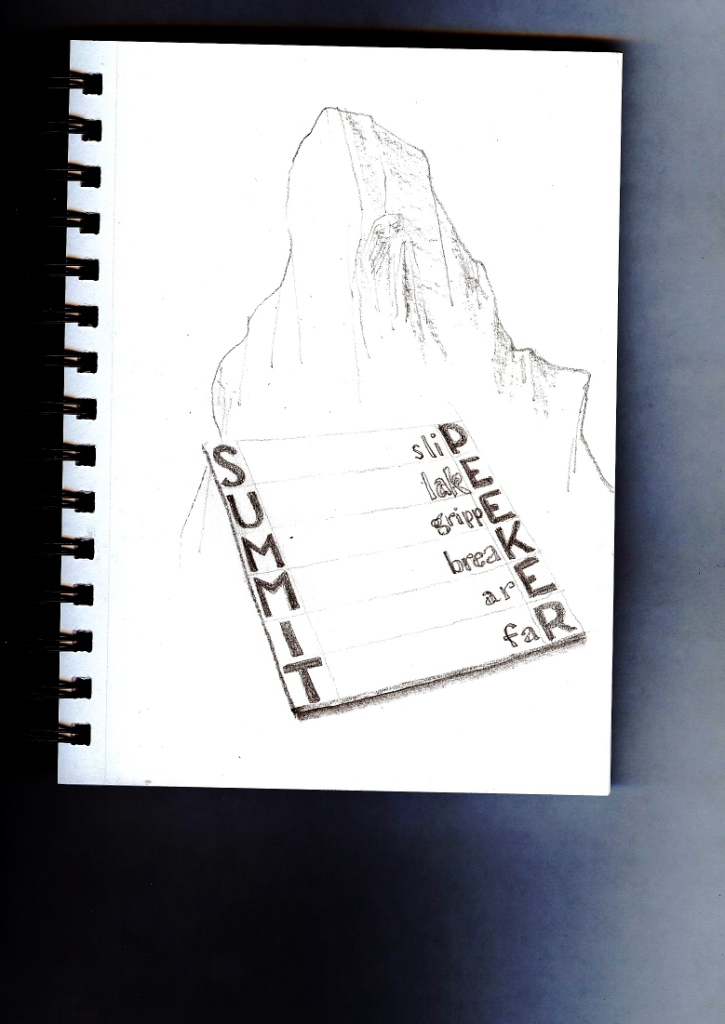 Apologies for the crude rushedness of the drawing. As has happened before, I was running out of disposable time before reporting to Night Clerk duty. What I intended was, at top left, a closeup of a flying insect; then down through the diagonal a closeup of the top of a building; then a not-so-closeup of a couple of skyscrapers, looking town at them; then the Earth-Moon pair; then the Milky Way Galaxy from afar. I like the conception; I’m ashamed of the execution. But I think the double-acrostic poem is OK without adornment. Here are the words: