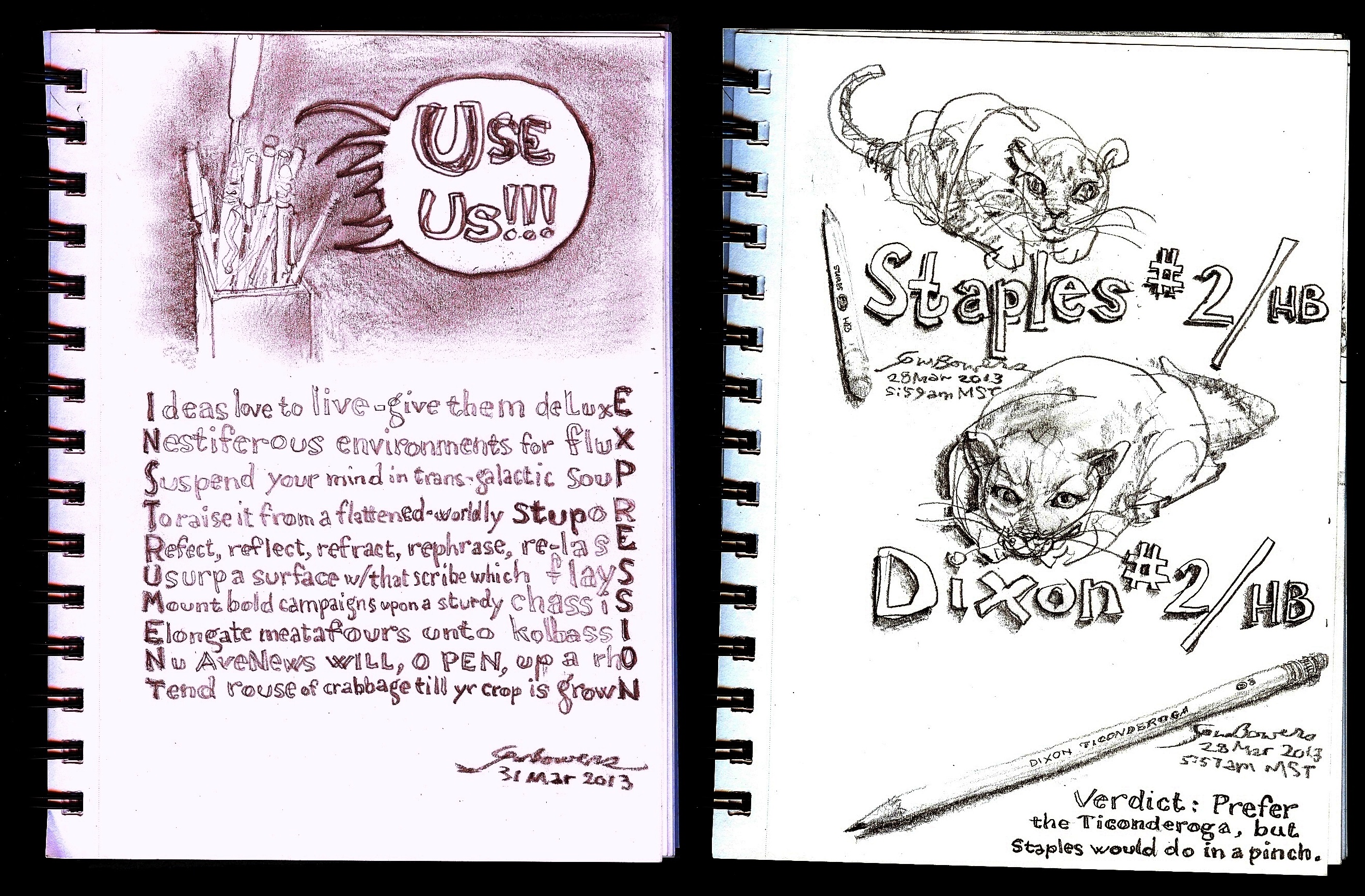 Since the subject was Instrument/Expression, I threw in a whimsical review of two pencils I used recently. One is the Staples store brand, the other the Dixon Ticonderoga (Yellow in this case; I prefer Black, though, just because it looks more Darth Vaderish). The two cats and their surrounds are drawn by the pencils they’re labeled with.