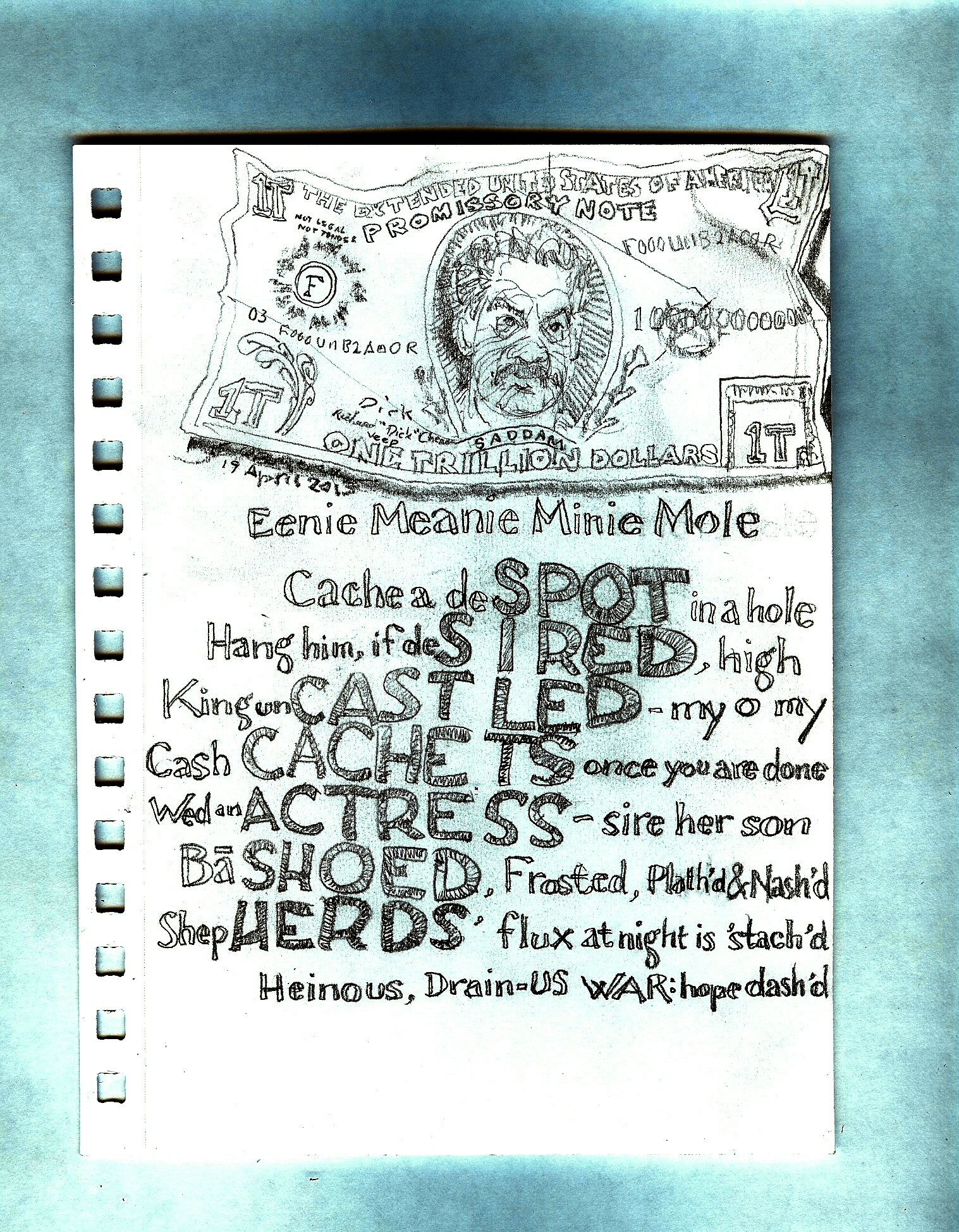 Weeks ago, noodling around, I did a crossword-puzzle-construction fragment, interlocking the Across of Spot, Sired, Castled, Cachets, Actress, Shoed and Herds with the Down of Cash, Cache, Actor, Shred, Steeds, Silts, Press, OED [Oxford English Dictionary], and TD [Touchdown]. Then last night I bookended the letter array with “Eenie Meanie Minie Mole” and “Heinous, Drain-US WAR: hope dash’d,” also fleshing out the array with lines that made it a peculiar multicrostic. My Raging Political Muse had had me write an anti-interventionist micro-polemic. Basically it says that our intervention in Iraq created a monster that cost US–as in United States–an ocean of blood and a trillion dollars in cash. This intervention, according to various sources of various reliability, began in earnest with the Cold War and someone named Qasim (or Kassem) showing Communist leanings. There was a coup in 1963 during the Kennedy administration, and there is some evidence that the CIA provided intel, if not more, to the coup-ers. Something important happened in 1975 and something else in 1980–I am not going to pretend I know what’s what; does anyone?