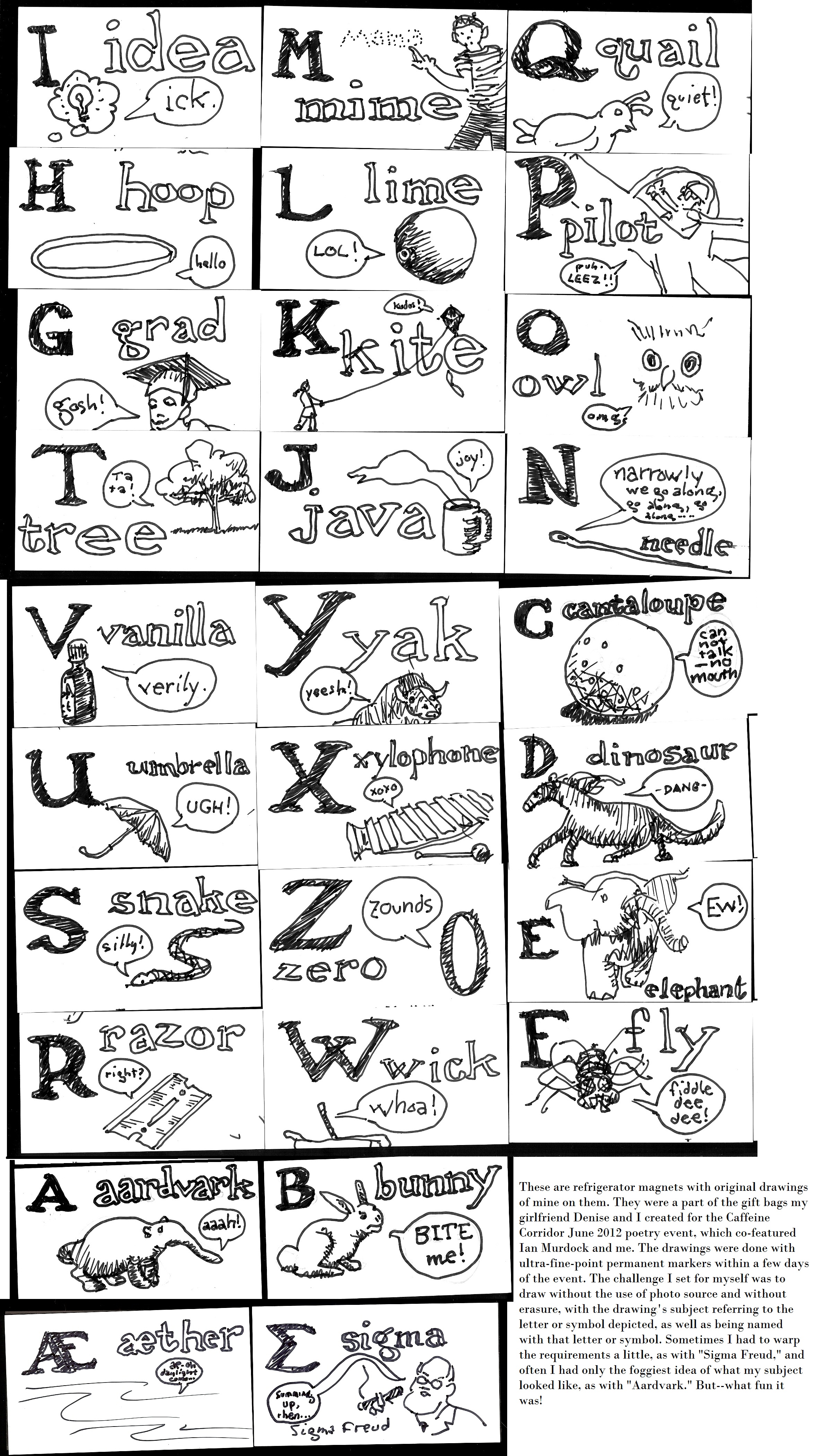Last June I co-featured at Caffeine Corridor, and gave gift bags that contained one refrigerator magnet each, and each unique. Here is the all-at-once: