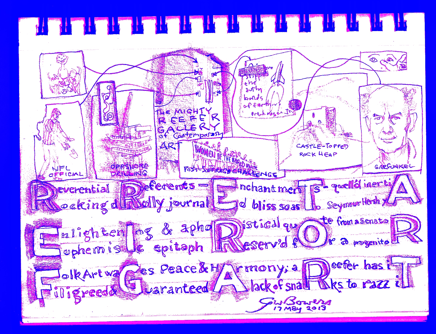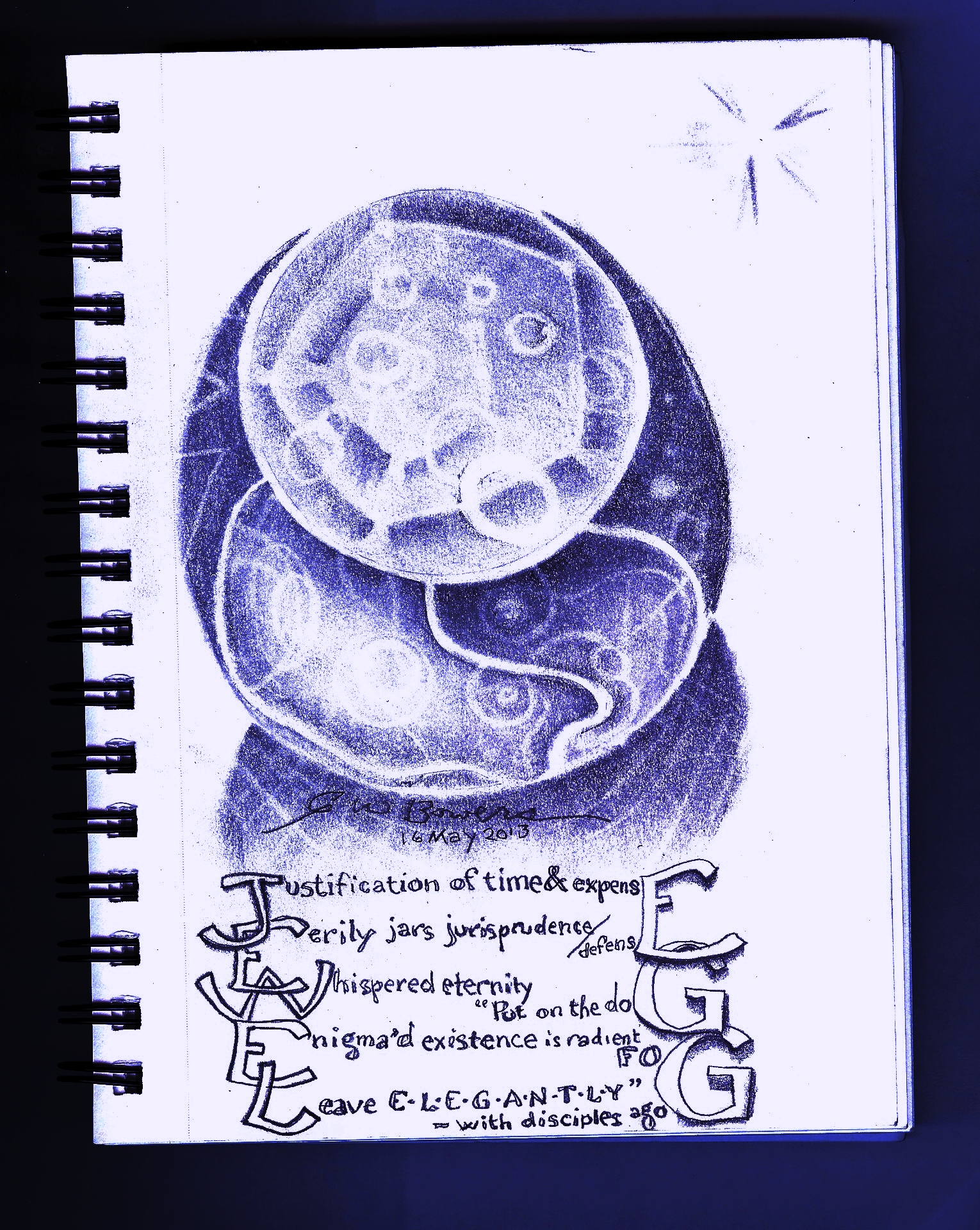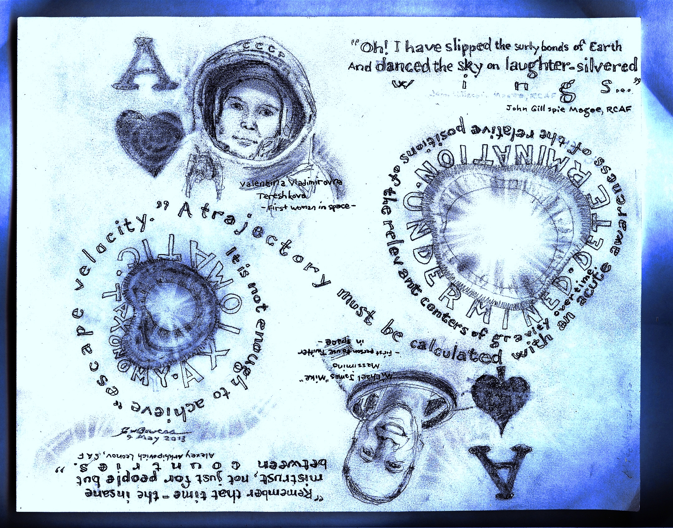 Meanwhile humans of two different hegemonies have ventured beyond our atmosphere. This page has a hint of the magnitude of that very real endeavor, the various forces (gravitational, ideological, economical, teleological, and so forth) influencing the effort, and the hope and the despair of the future of human space exploration. Part of the hint is that in free fall, there is no rightside-up; we groundlings can’t take in a page like this in one glance, or even one gaze. Betters than us (or is it we?) will follow, I hope.