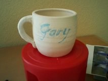 A new deadline was set: August the 14th, their wedding anniversary. Last night I regretfully told Debby I would probably miss that deadline, too. Gary did get an updated photo of his cup, still in the greenware stage but personalized with his first name in blue mason stain: