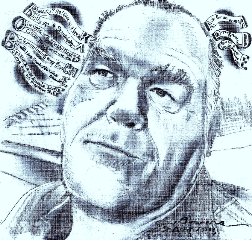 Here is a not-quite-successful go at capturing the face of a Facebook friend of mine, at his request. His real jaw is much less like Mussolini’s, and there is enough inaccuracy in this and that detail to make me want to try, try again. I will some fine day. Meanwhile you might find more of the man in the words than the draughtsmanship.