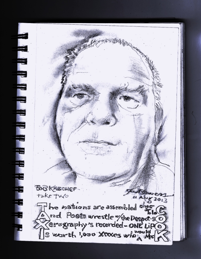 Readers of the last blog post will recall that I tried, and did not quite succeed, to capture my friend and fellow poet Bob Kabchef’s visage on paper. As a portraitist, when I misfire I have a choice: move on, or get back on the horse and try again. It is ALWAYS better to try again, though fear of repeated failure hangs like a wet-sodden cloud over the fragile-egoed creator’s head.