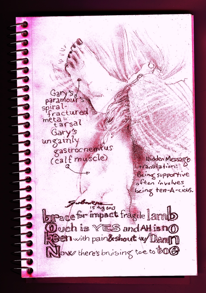 My poor and darling Denise has sustained a spiral fracture of her leftmost metatarsal. Earlier this week I tried giving her some relief by supporting the weight of her lower leg with mine. It was not all that successful, relief-wise, but proved usable fodder for journal-paging, especially since I occasionally update my Facebook status with “Further Adventures of Denise and Gary.”