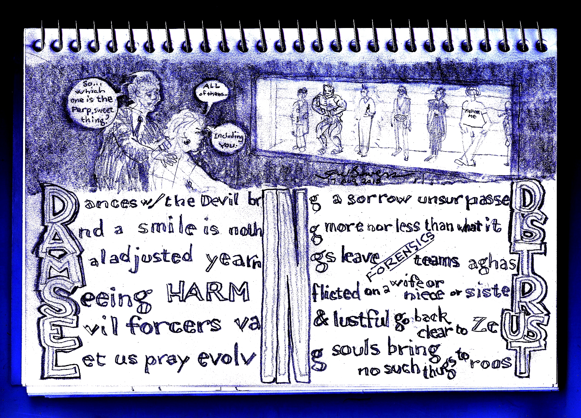 This page was done under conditions of extreme sleep deprivation and sporadic retail sales. Looking at it, I don’t know exactly why I went semicolon crazy. I do know that my hero Kurt V had scorn for semicolons, thinking them hermaphroditic.
