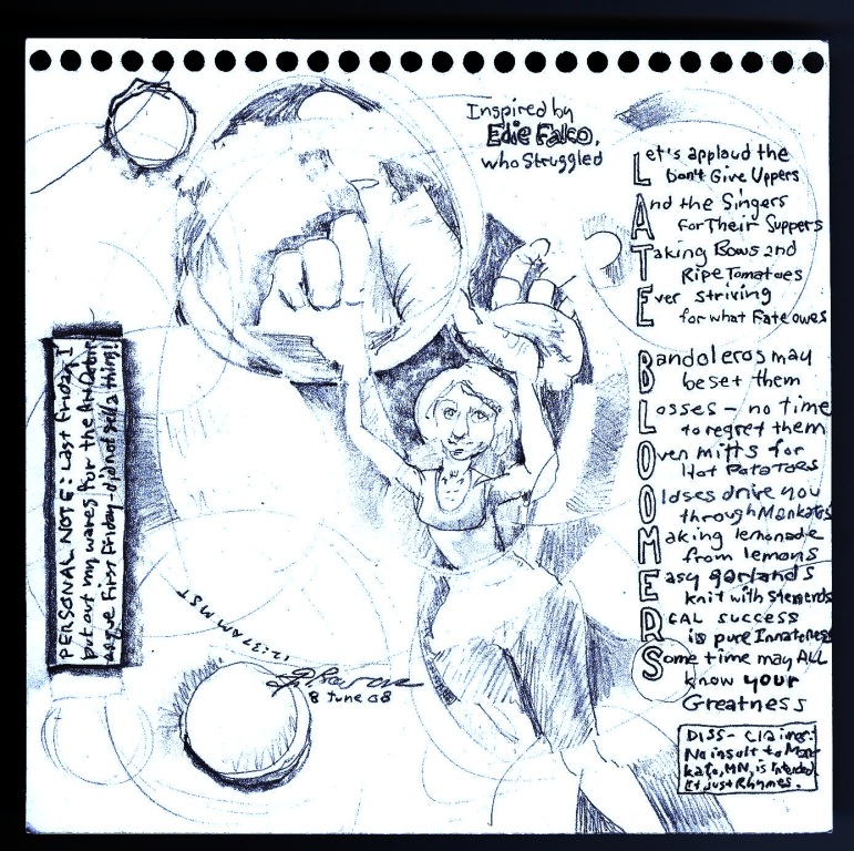This is part of the chess-piece-based series done in the early 2000s. The surface is a faux finish obtained at Ace Hardware. The original was a fountain, including a birdbathy bowl with the same surface treatment, and a small pump, also obtained at Ace. The bowl started to get mineral-deposit funky, and the fountain effect (out of the top of the head) didn’t really add to the piece, so the bowl and the pump were ditched. Amazing, the similarity in facial features to Denise’s, though this was done years and years before we met.