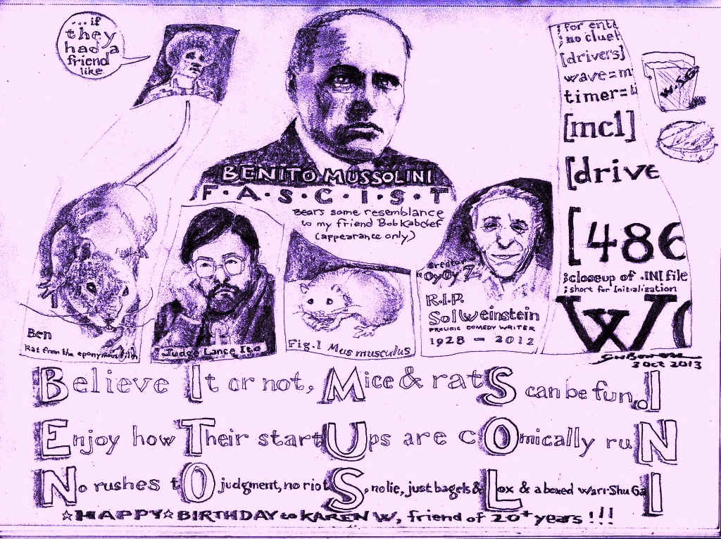 Long story a little longer: together again for the first time, we have Ben the rat from the movie bearing his name (and a young and relatively unwarped Michael Jackson singing the last line of the song, with Ben’s tail doing double-duty as the pointer of a word balloon; I’m absurdly proud of this visual pun); Lance Ito, the judge in the O.J. Simpson case; Mus musculus, the common mouse (the word Muscle is from this Latin word for Mouse); Sol Weinstein, comedy writer extraordinaire; and a closeup of an .INI (pronounced “innie” or “eeny”) file. .INI files, also and less confusingly known as initialization files, are bits of software that execute upon startup of the computer. Comment lines, which are ignored by the executable, begin with a semicolon.