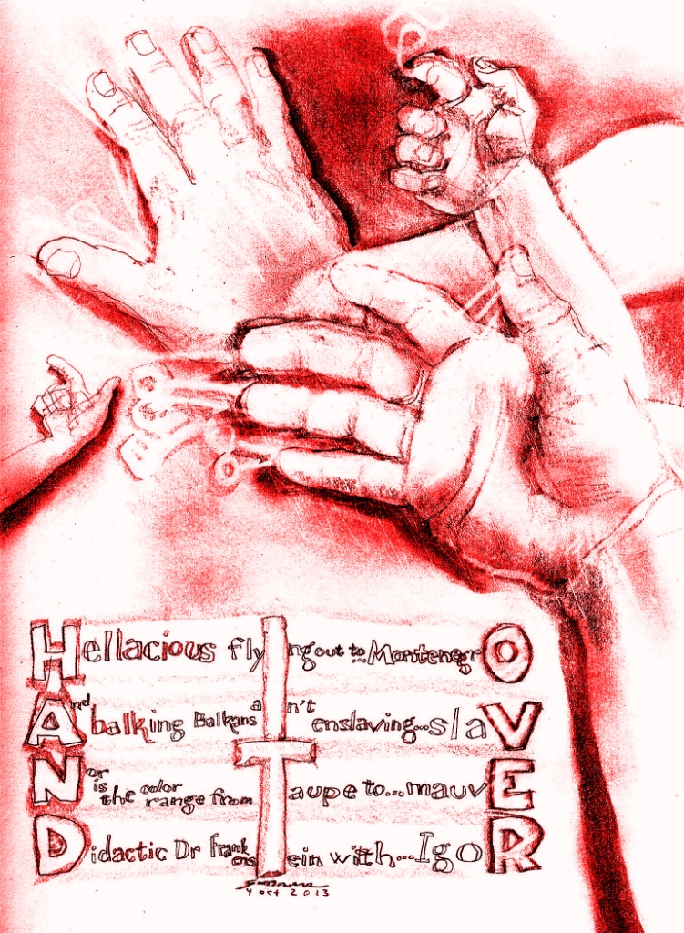Here is yet another hand study, in tandem with a novelty acrostic for entertainment purposes only. Many of us “draw-ers” started out by drawing Hands; the only more fascinating anatomical subject matter for the beginning artist is Eyes. I’d estimate I’ve done at least a thousand Hand exercises in the last fifty years; and this time I did it to warm up for a far more important project, one that has taken several days and may yet take several more. Meanwhile, there’s this, and these words:
