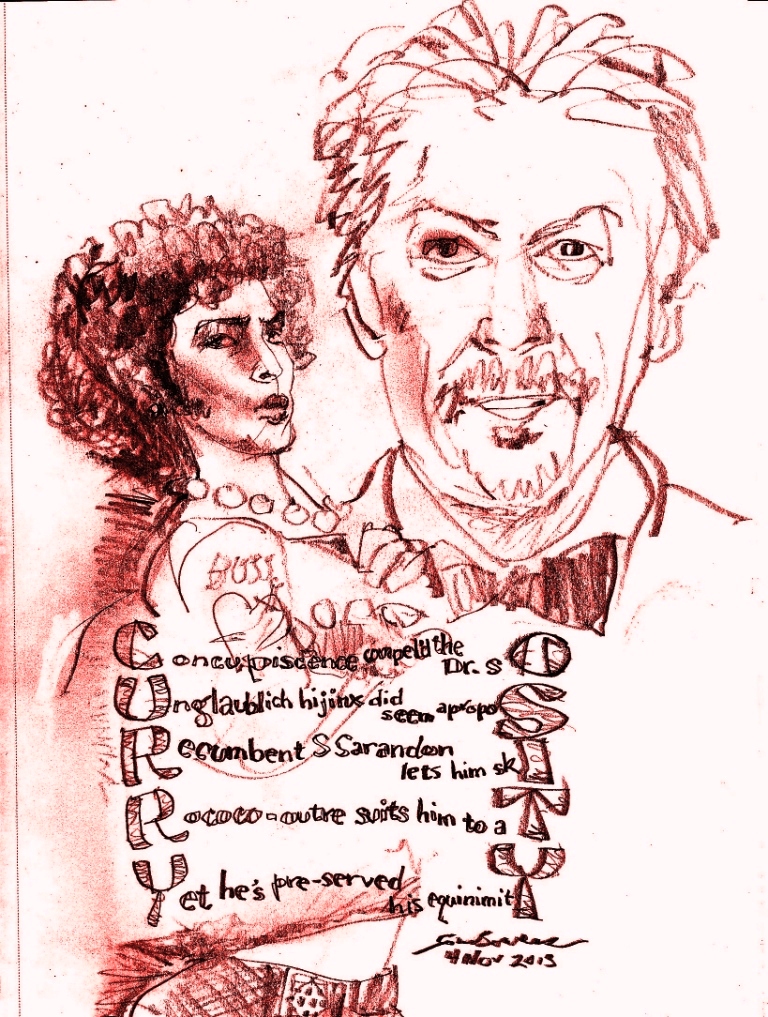 This page came to be because last month I did a quickbunny page just to do a page, and the acrostic happened to be TIME WARP. I’d intended to publish it today, but could not find it. So, “Well, why not do a page on Tim Curry?” So I did. So THEN I found the TIME WARP page. And since my Canadian friend Michel Lamontagne had admired a post wherein I combined 2 and 3D, I repeat, with an old, baggy-wrapped self-portrait sketch of mine that is apropos because it’s sort of like the Picture of Dorian Gray now: