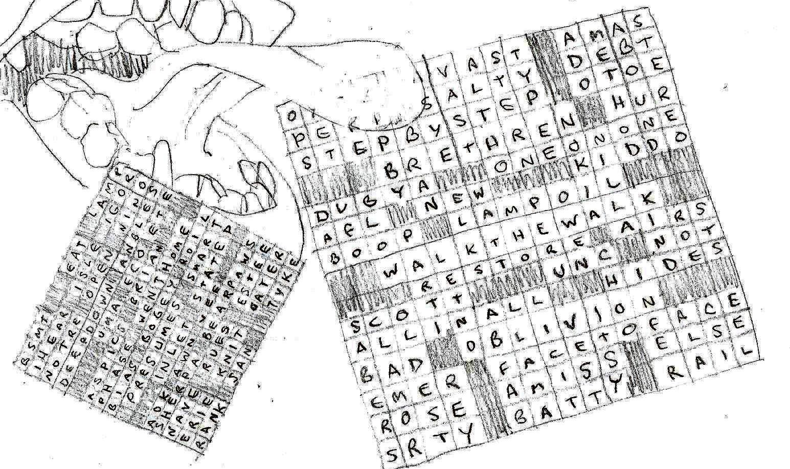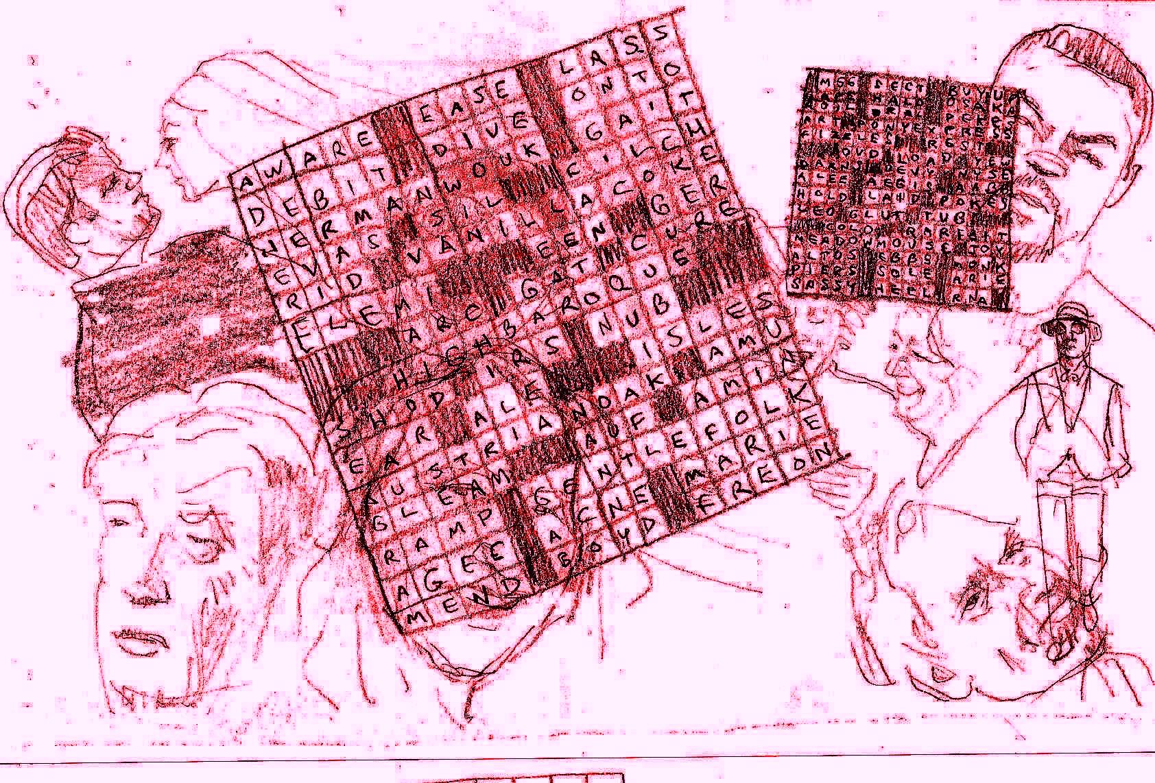 Lately I’ve been combining crossword puzzle grids and face/figure studies. This one could use some cleanup and some original, not newspaper-derived, crossword grids.