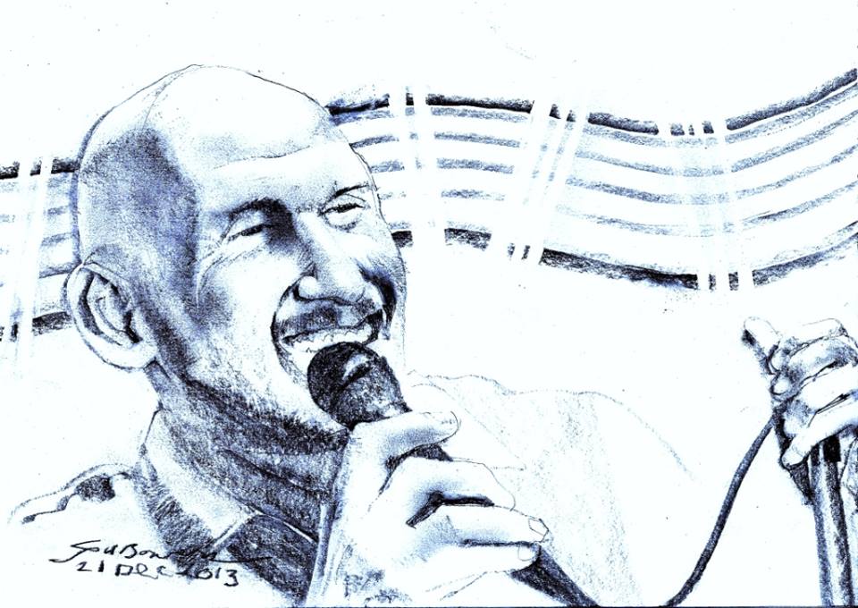 On December 21st I put the finishing touches on a portrait of a musician I have never met. It is based on a photograph taken by one of the residents of the retirement community I work for, which she gave gracious permission to use as a photo source, taken by her during one of his gratis, heart-warming performances at our community. (The photographer prefers to be uncredited.) Armed with the photo and the musician’s first name and the fact that he’s based in the Quad-Cities area, I found him and his Facebook page on the Internet, and wrote him for permission to post my portrait. Then my laptop died.