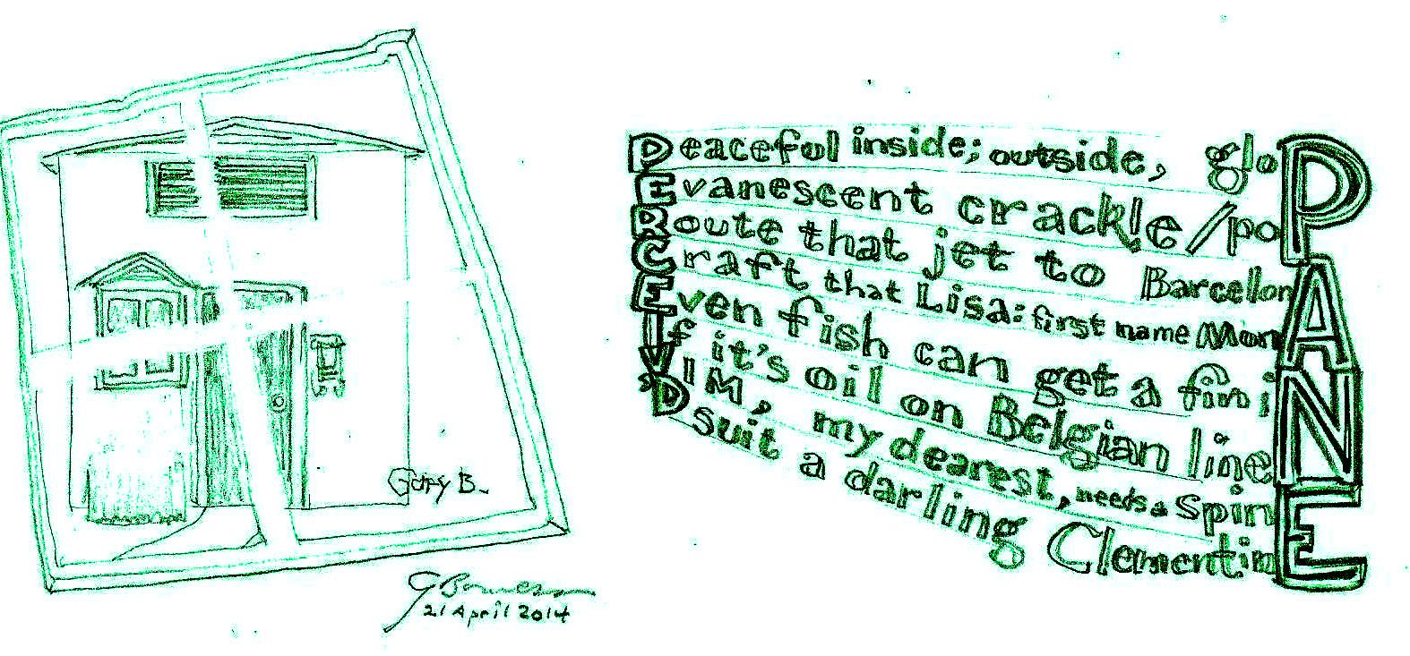 The crude drawn house inside the skewed window pane hearkens back to the early early Sixties. The teacher had us draw houses; I drew three or so. I distinctly remember that the one I drew with windows and a door got a gold star. The one with windows but no door got a silver star, and the one without windows got no star at all, even though it was a faithful rendering from memory of the windowless west side of our house.