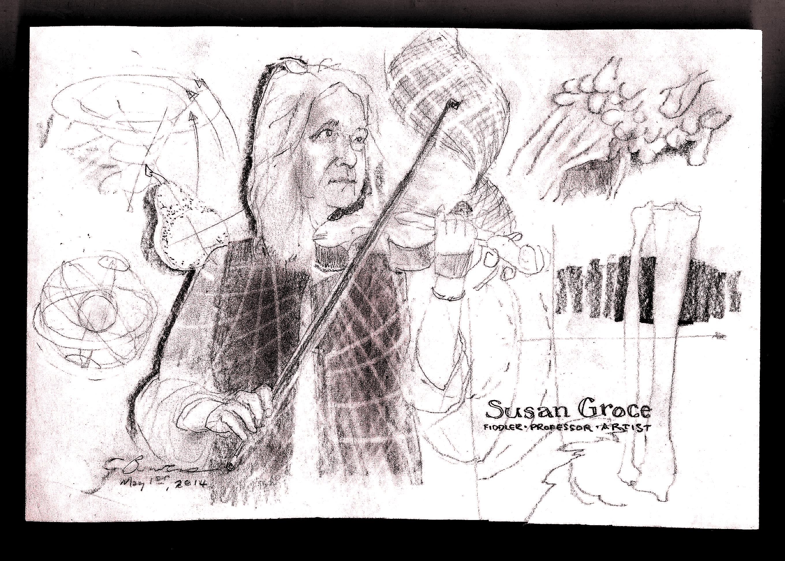 More on Susan, and a triple-acrostic poem (SUSAN/PRINTMAKER/GROCE) will follow in a soon-subsequent post. Meanwhile, here is a study of the good Professor playing Celtic fiddle, surrounded by thumbnailesque images from her notebook and from electron microscopy. Stay tuned…