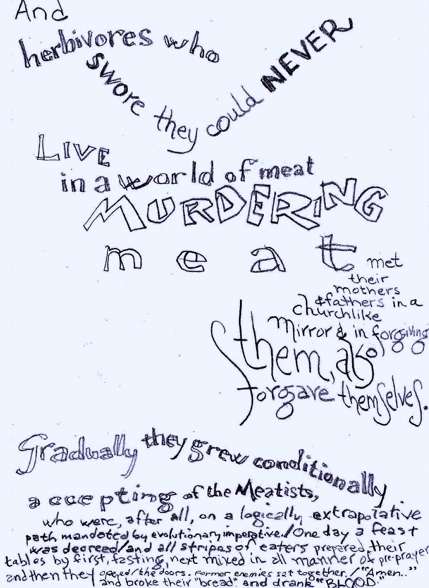 Lastly, we read this, which we’d written together on a sketchpad. First Vic wrote one word, then I two, then she four, then I eight, and so forth till we got to 32, and then we imploded it back to the final word, which we co-wrote: “BLOOD.” No transcript is available at present, but wrestling through it is half the fun…