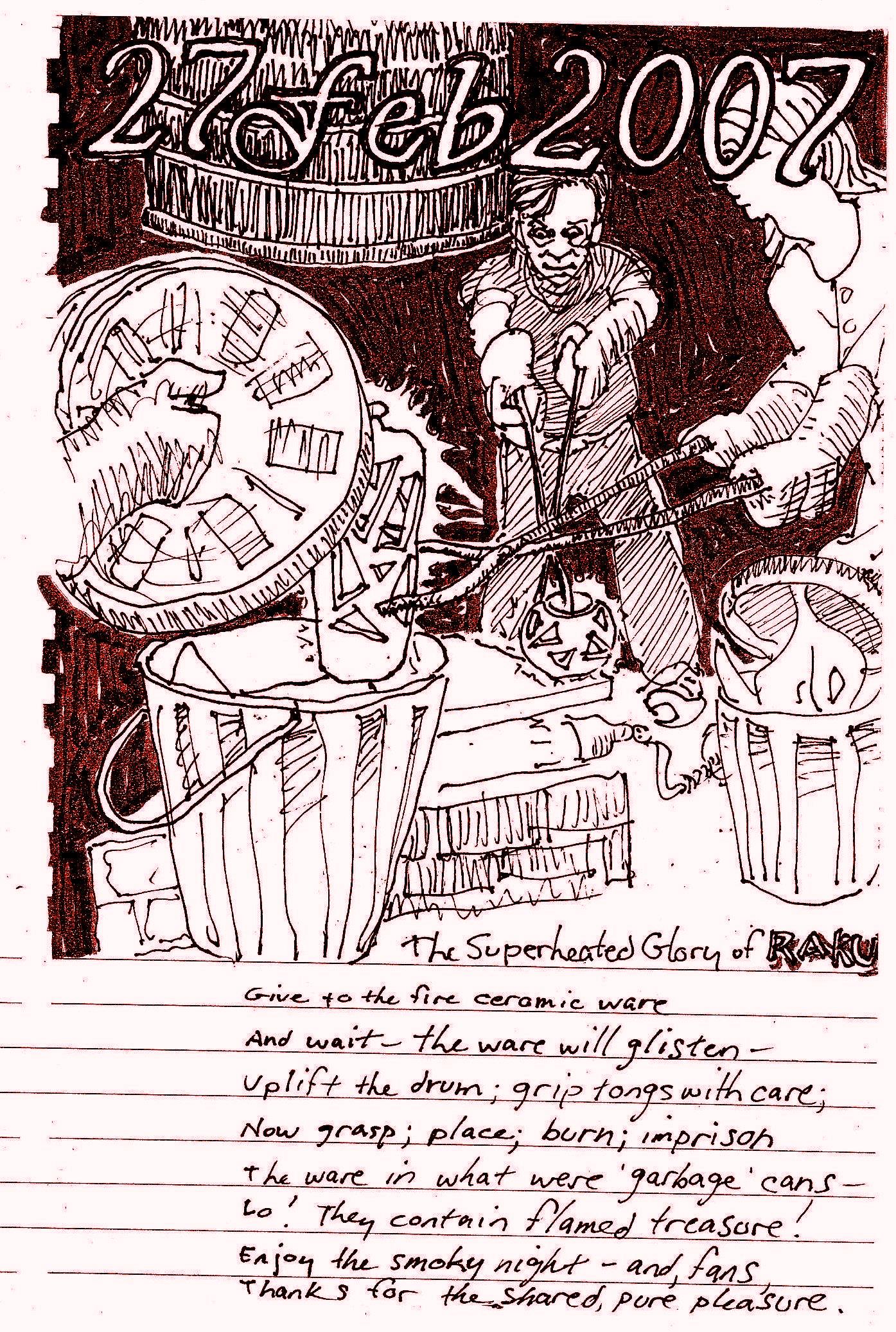 The process as practiced at Phoenix College in the mid-2000s involved preheating raku-glazed ware in an old open-topped kiln, placing the ware where a fifty-five-gallon drum could be lowered to contain it, gas-firing the ware till it looked through the peephole as if it were sweating, raising the drum, and pulling the ware out with tongs and placing it in metal trash cans containing combustible material. The material would catch fire and then the trash can lids would be slammed down, trapping the smoke within. A couple of hours of that and you’d smell like you’d been in a poker room full of cigar smokers. You’d be tired, hot and probably singed a little. You’d feel Glorious.