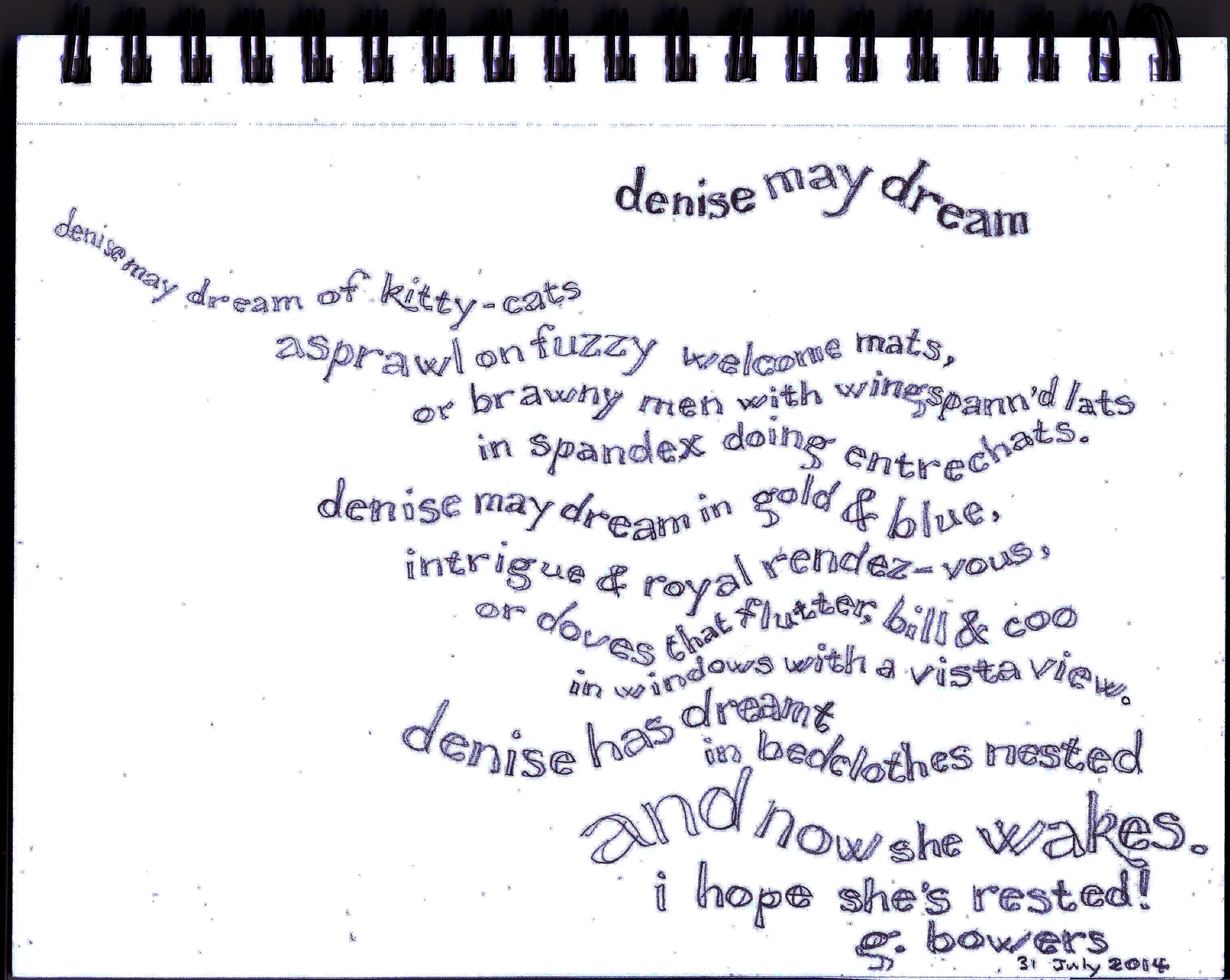He assented and then started sending me odd words via text message. On July 1st he offered “Nigmobophilia.” (A love of drive-by racist epithets?) On the 3rd he reminded me of “Bigglesworth,” which he didn’t make up put lifted from the name of Dr. Evil’s cat in the Austin Powers movies. (Fairly recently he’s called me “The Big Stuff” and “Bigby,” both of which I am egomaniacal enough to like; but then the alliteration shaded over into “Bare Naked,” which I didn’t like at all, and then “Bear,” which is OK but echoic of what my high school sweetheart and I called each other in the early 70’s. Lately when I call him and he sees from the number it is me, when he picks up, he usually says “Bear!” with some enthusiasm. If he’s not enthusiastic about talking to me he’ll just let it go to voice mail.)