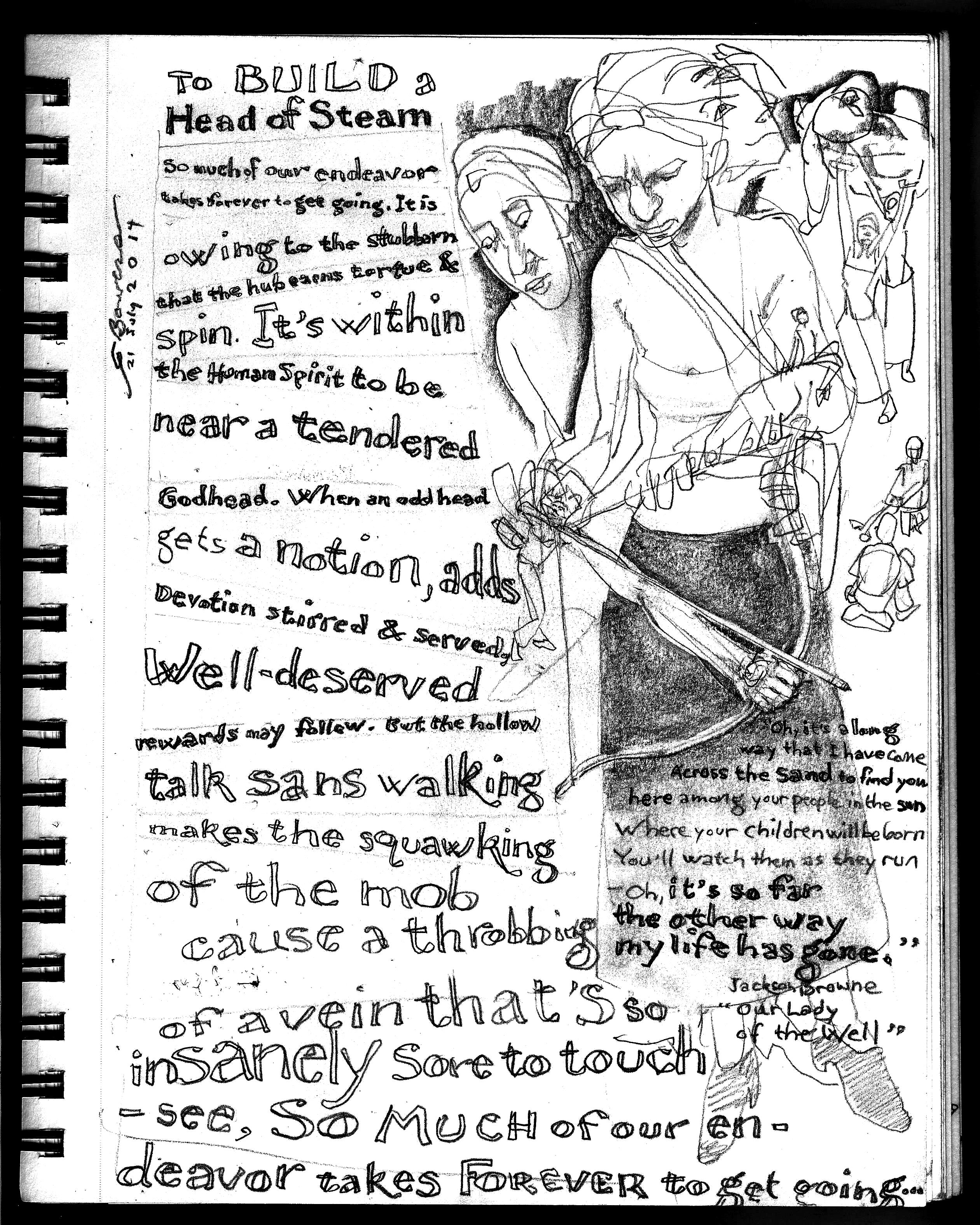 So much of our endeavor/takes forever to get going. It is/owing to the stubborn/that the hub earns torque &/spin. It’s within/the Human Spirit to be/near a tendered/Godhead. When an odd head/gets a notion, adds/Devotion stirred & served,/Well-deserved/rewards may follow. But the hollow/talk sans walking/makes the squawking/of the mob/cause a throbbing/of a vein that’s so/insanely sore to touch/–see, SO MUCH of our en-/deavor takes FOREVER to get going–