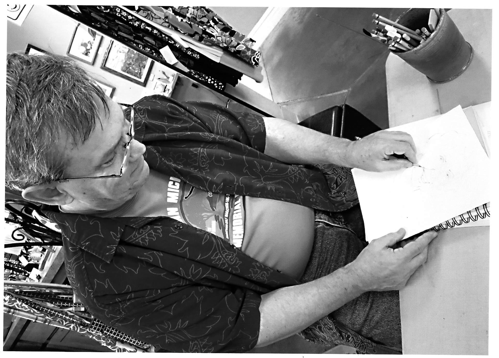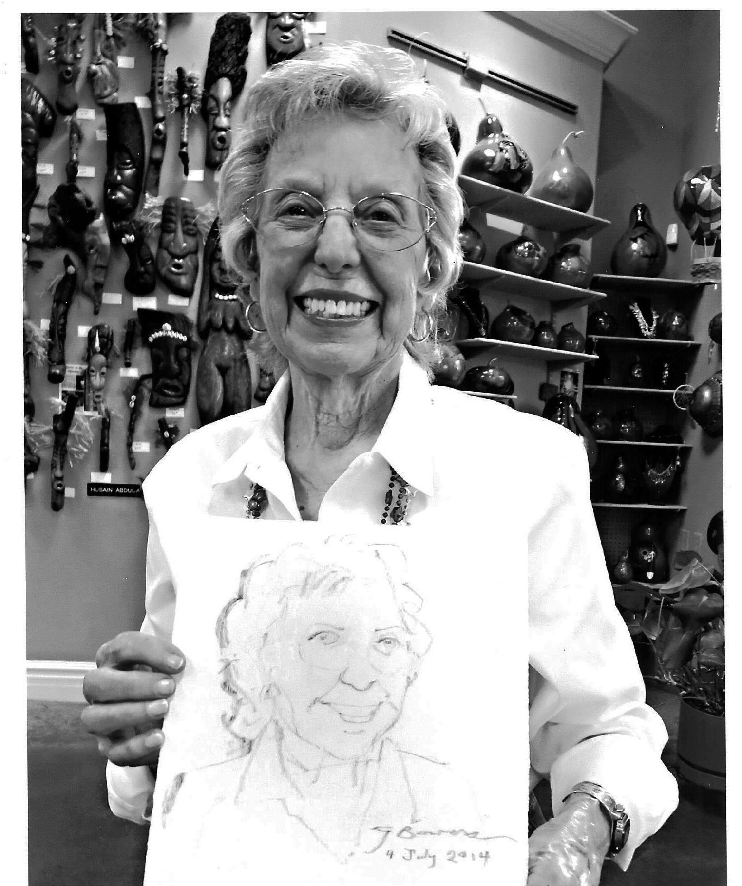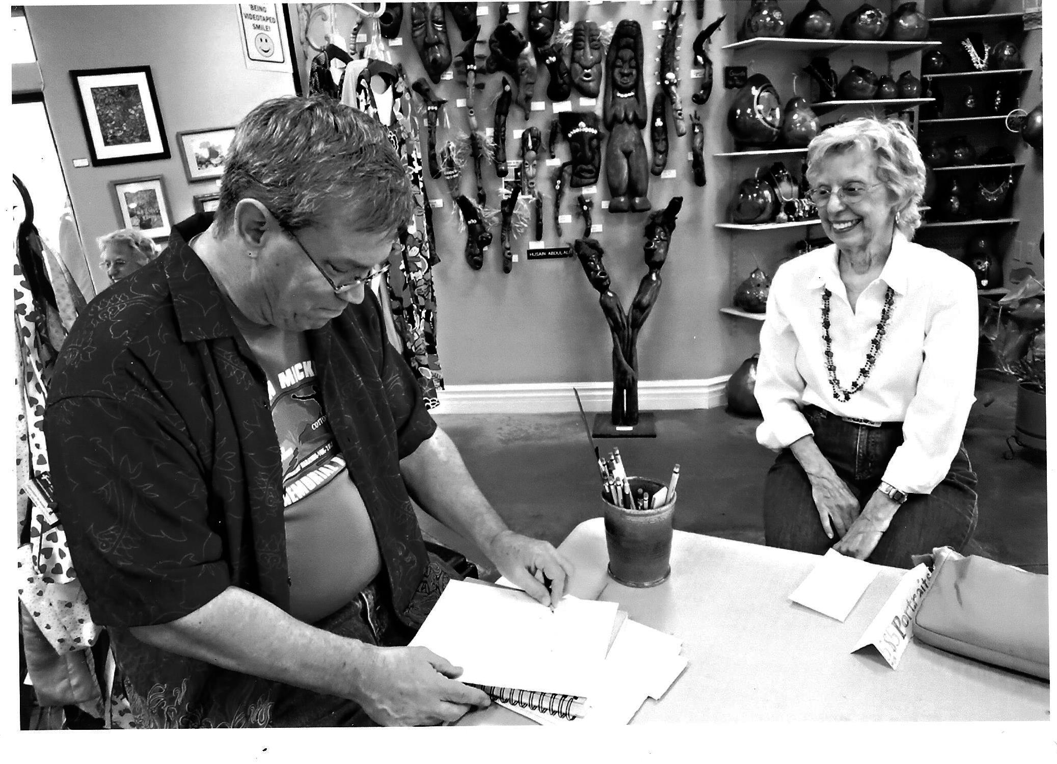 On the glorious 4th of July, as a special event of the Village Gallery for First Friday, I sat at a table by the south entrance and offered to exchange 5 minutes of portraiture, graphite on deckle-edged 8″ x 10″ 90-pound Stonehenge paper, for $5 a pop. There were only a handful of pops, it being the 4th of July and dramatically cloudy to boot. But here is a nice passage of moments, photography courtesy of my gallery colleague Lenore, modeling courtesy of Pat, a sweet lady I met through my job.