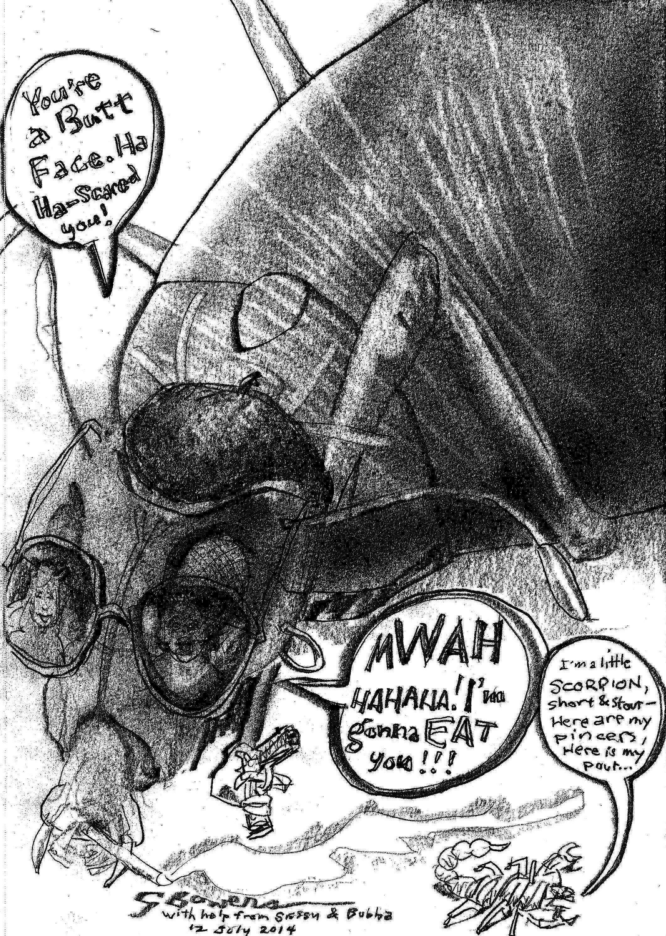 Yesterday I showed Denise’s grandchildren a drawing in progress of a terrifying bug in extreme closeup. With their coaching I was able to de-terrorize the bug a great deal. Before we were done the bug was smoking a cig, wearing a beret and cop-sunglasses, wielding an ineffectual gun, and gaining a sidekick scorpion singing to the tune of “I’m a Little Teapot.” Reflected in the cop-sunglasses were Sissy and Bubba’s faces, Bubba mock-scared and Sissy mocking-grinning. All of the enhancements helped make a going-nowhere faked-up study become a showcase of the bravery of children in the face of the unknown. Bless the Beast and the Children! [smiles]