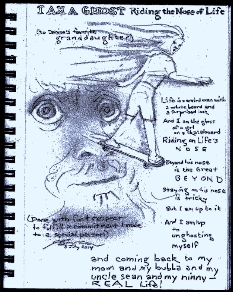 Here I fulfill a commitment to Denise’s granddaughter. Here is how I acquired the commitment: On canvas was a painting that said, clearly to anyone wearing glasses, “A Ghost Riding the Wave of Life.” Not wearing glasses, I misread it as “A Ghost Riding the Nose of Life.” She thought it was funny; I thought I should make up for my goof, so I told her I’d write a poem entitled “I Am a Ghost Riding the Nose of Life.”