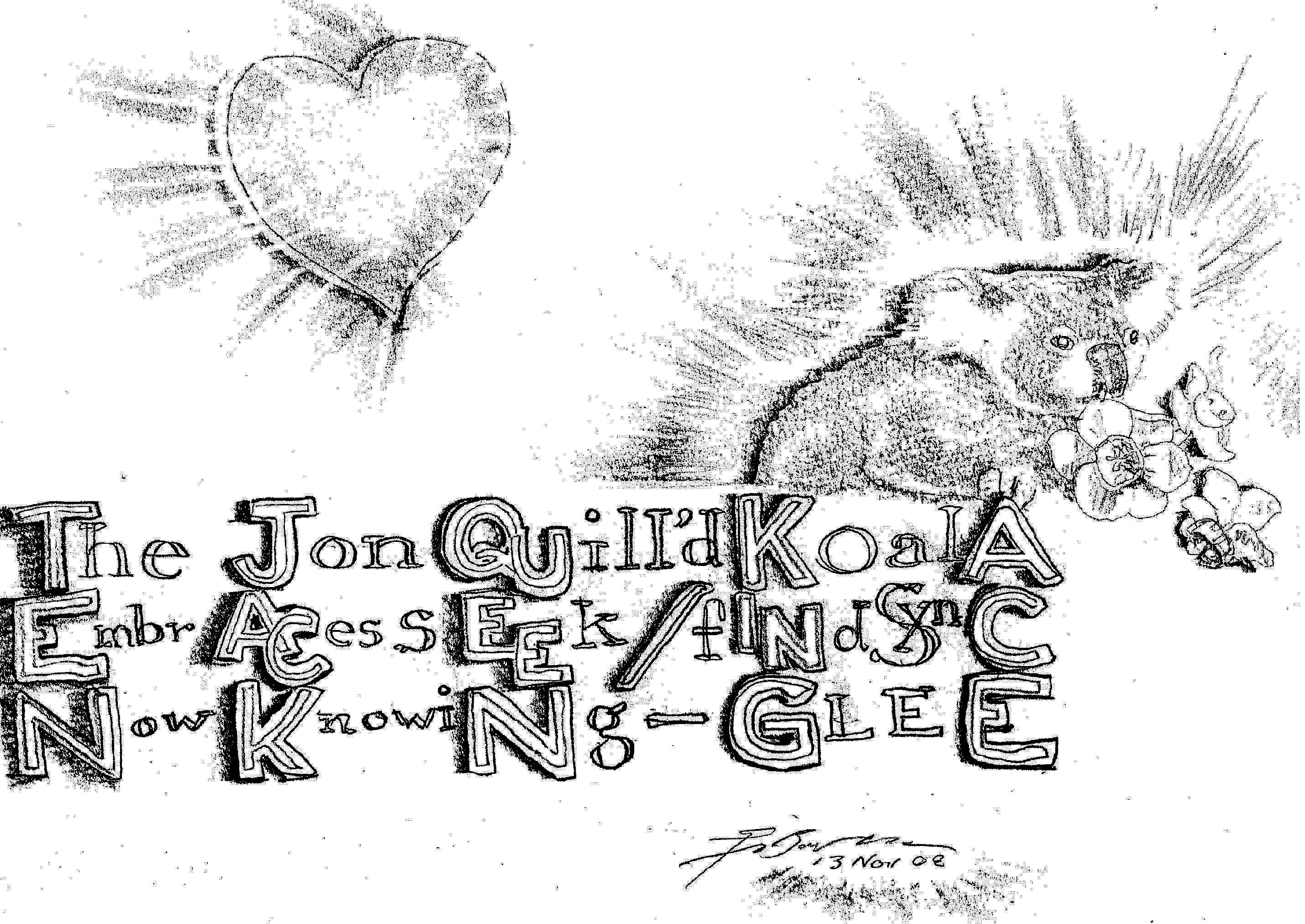 Transcription: “The jonquill’d koala embraces seek/find sync now knowing–glee.” Ten words. Quintuple acrostic. Hole in one; royal flush.