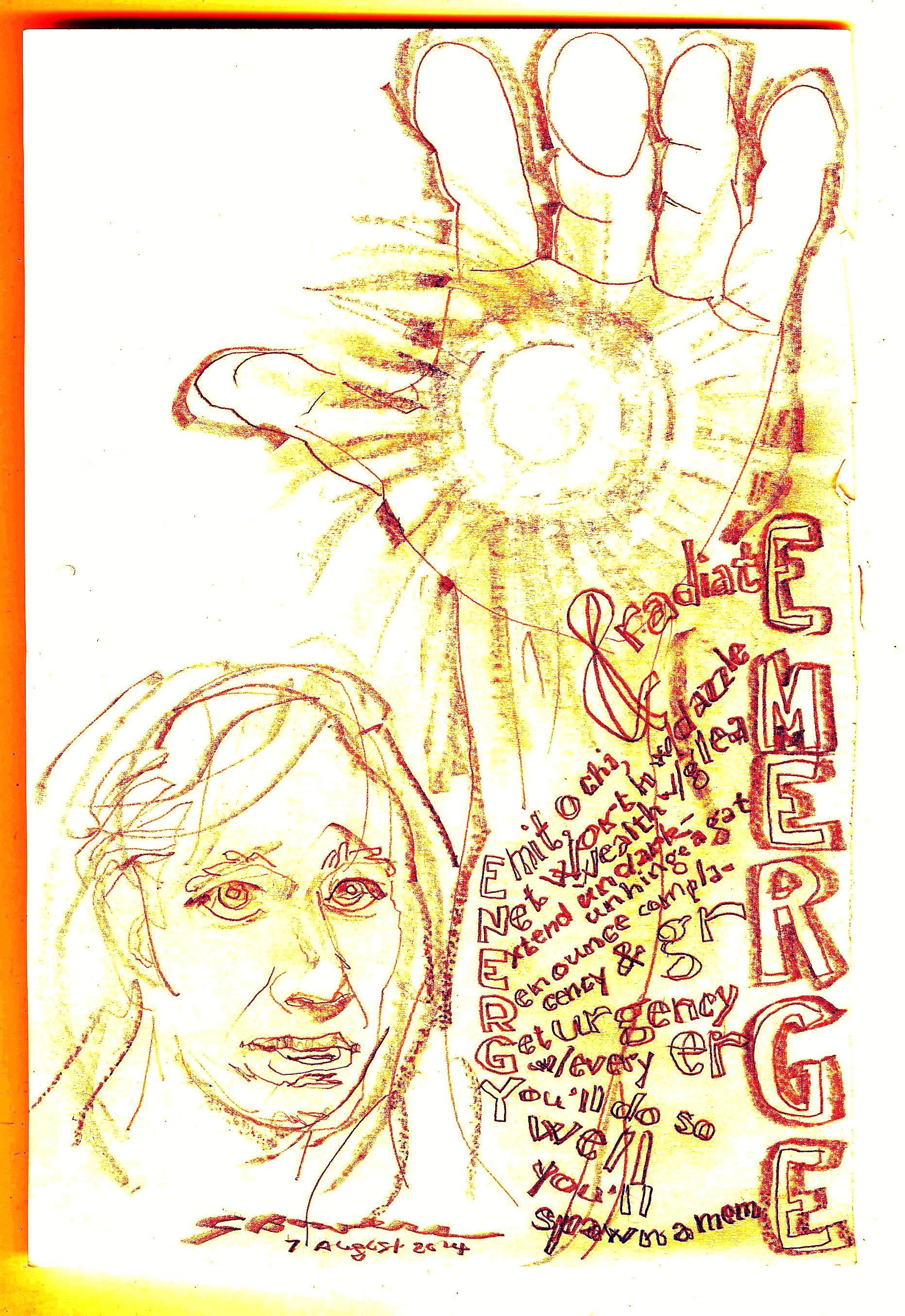 In honor of my transgendered friends in San Diego, I transgendered my image’s protagonist. She was at first a balding, graying, self-lacking dude. Now she’s jittery but alive.