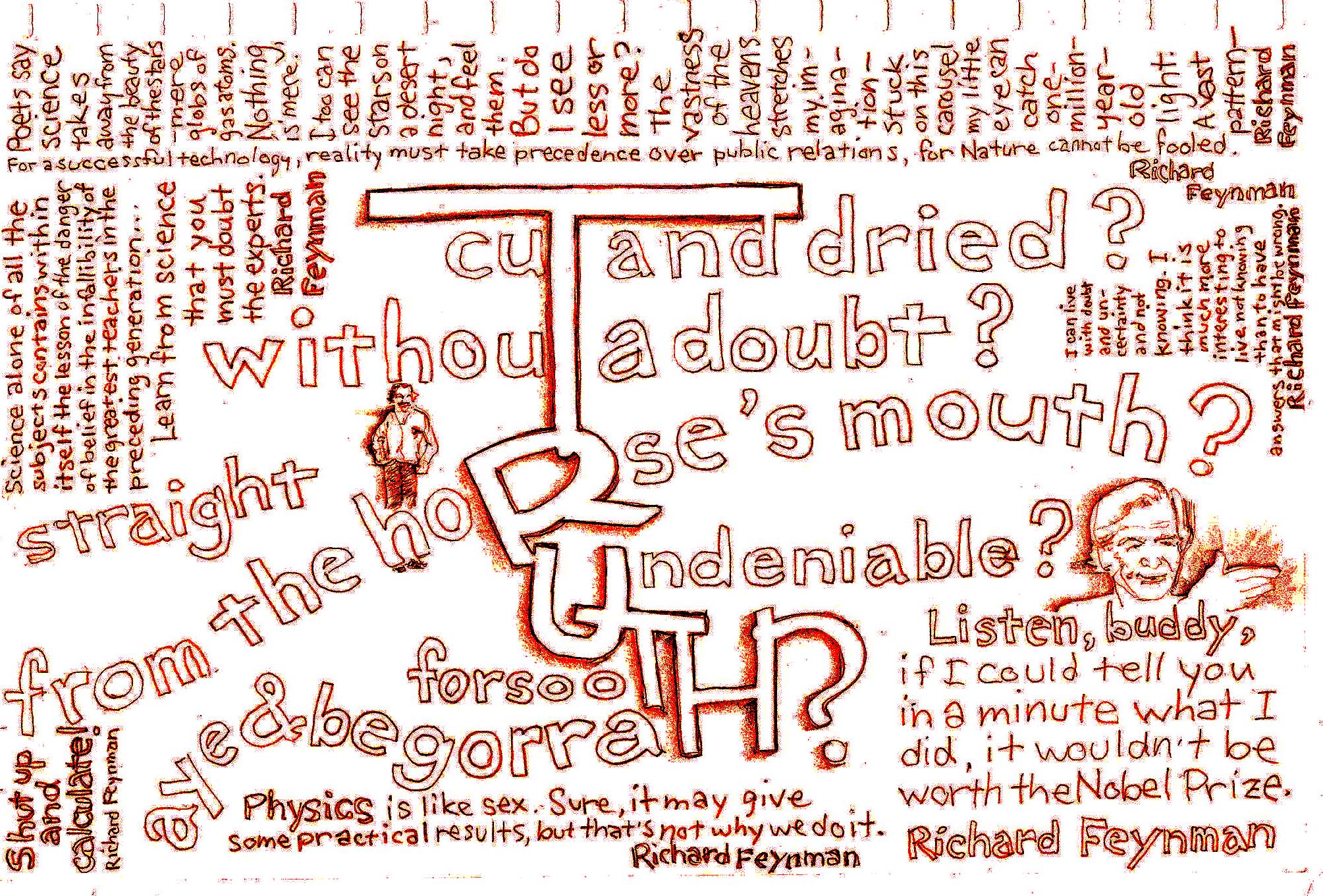 Here is an unsigned, undated page I did a few years back. It is almost entirely of Richard Feynman quotations, though I do acrosticize the question/word Truth? with “cut and dried? without a doubt? straight from the horse’s mouth? undeniable? forsooth? aye & begorrah?” because if Professor Feynman taught me one thing, it is that Doubt is essential for seekers of Truth.