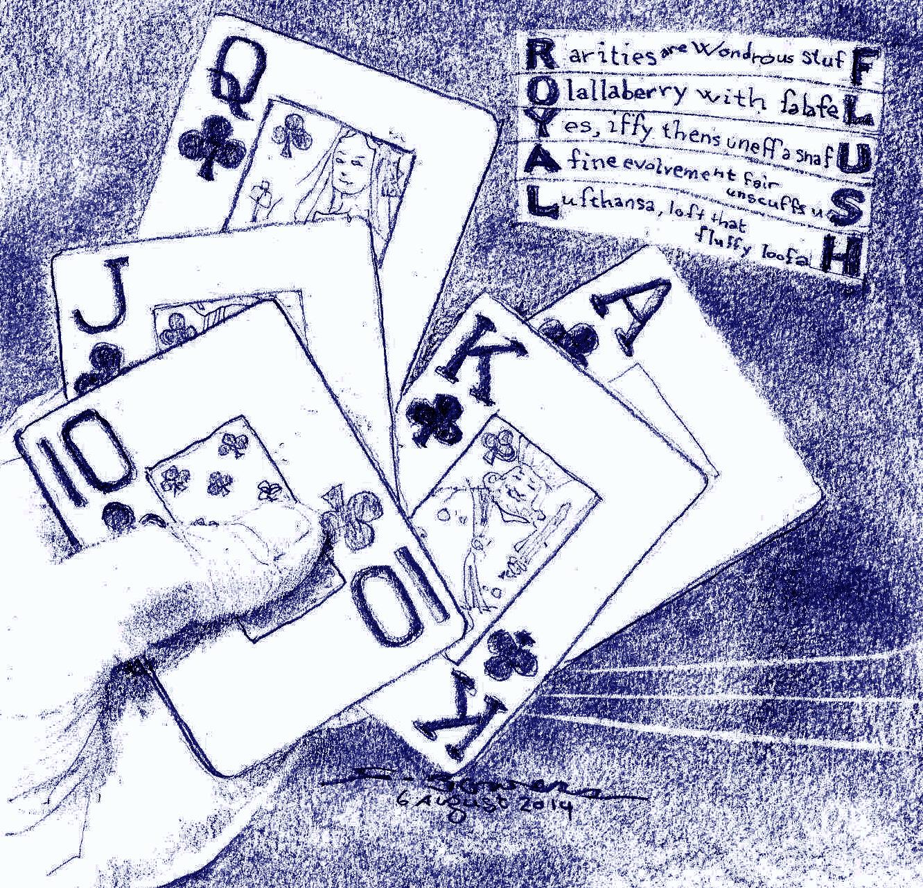 Back in Aught-Eight, I did a quintuple acrostic that was the equivalent of a hole in one in golf, or a Royal Flush in poker. And, joy of joys, the acrostic itself listed the five cards that a Royal Flush has, in numerical order: Ten, Jack, Queen, King, Ace. Ever since I started this blog, I’ve wanted to feature that acrostic–but I couldn’t find it…till today. Here it is: