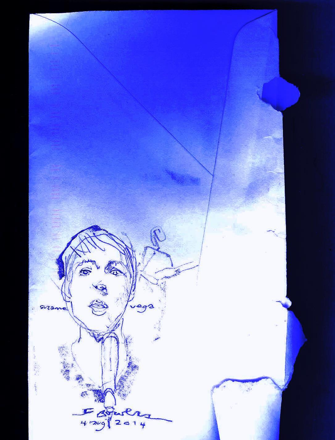 I’m glad I didn’t know the truth before just a few minutes ago. If I had, the above portrait would likely have not come to be. Here is the sequence: I was listening to an acoustic performance by Jackson Browne of “These Days” and then “Running on Empty.” This was after his induction into the Rock and Roll Hall of Fame (2004) but probably not by much. I thought of Suzanne Vega and “Luka,” probably because she and her song entered the public consciousness about the same time as JB’s “Lives in the Balance.” Watched a vid of “Luka” with lyrics and then “The story behind Luka.” (True: a nine-year-old boy named Luka lived upstairs from her; curiously, his last name was also Vega. False: he was not abused, to Suzanne Vega’s knowledge.) While watching “The story behind Luka” I realized that “Luka” was the only song of Suzanne Vega’s that I knew! That wasn’t right. So I found a vid of her doing “Solitude Standing,” then thrilled to her born-to-sing-folk voice, and then the impulse came to freeze the vid and do a quick portrait. Seeing an empty and torn envelope, I remembered Lincoln’s memorable scribbling on the back of such and thought, “Ms. Vega deserves that same quirky immortality–it’s perfect, isn’t it?–let’s see what happens.” (That is a paraphrase; I can’t remember what I was thinking, but that was the spirit of it.) The sketch went well. They so often don’t. I decided to post it on my blog, but I wanted details of Lincoln’s envelope. Then and only then did I discover that the envelope story was a myth.