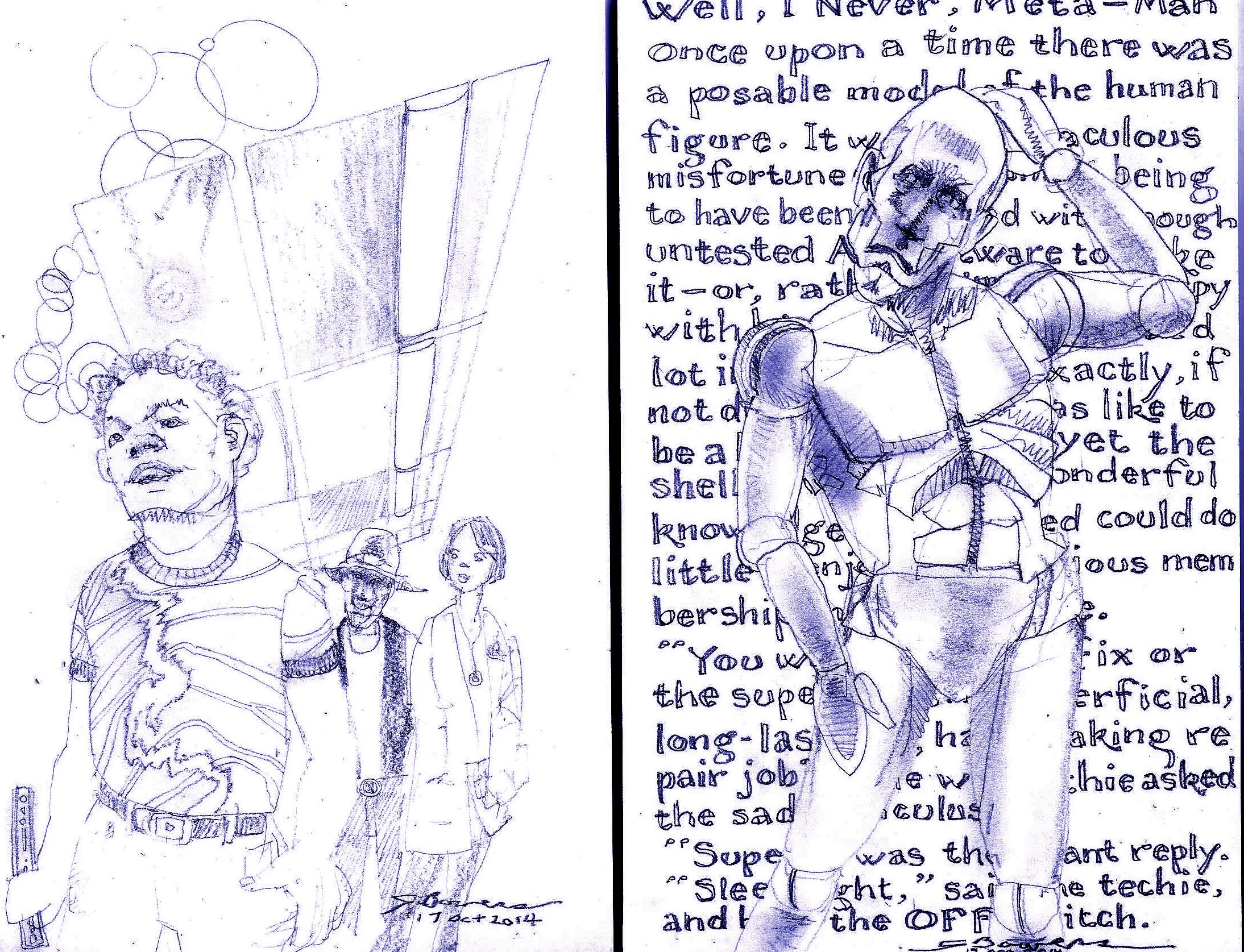 Hidder Midst says nothing and thinks bubbles–a true Superhero in search of an Origin Story. Meta-Man may have more to say than Spielberg’s A.I. or Asimov’s “The Bicentennial Man,” but he may just be all about a pose occluding text. The Book of Ecclesiastes says both “All is vanity” and that there is nothing new under the Sun. But that second one is a trick answer, as far as we mere mortals go. We are NOT “under the Sun.” We are OVER the sun, just as the Moon is over us. Should we fall into the Sun, we’d be falling down.