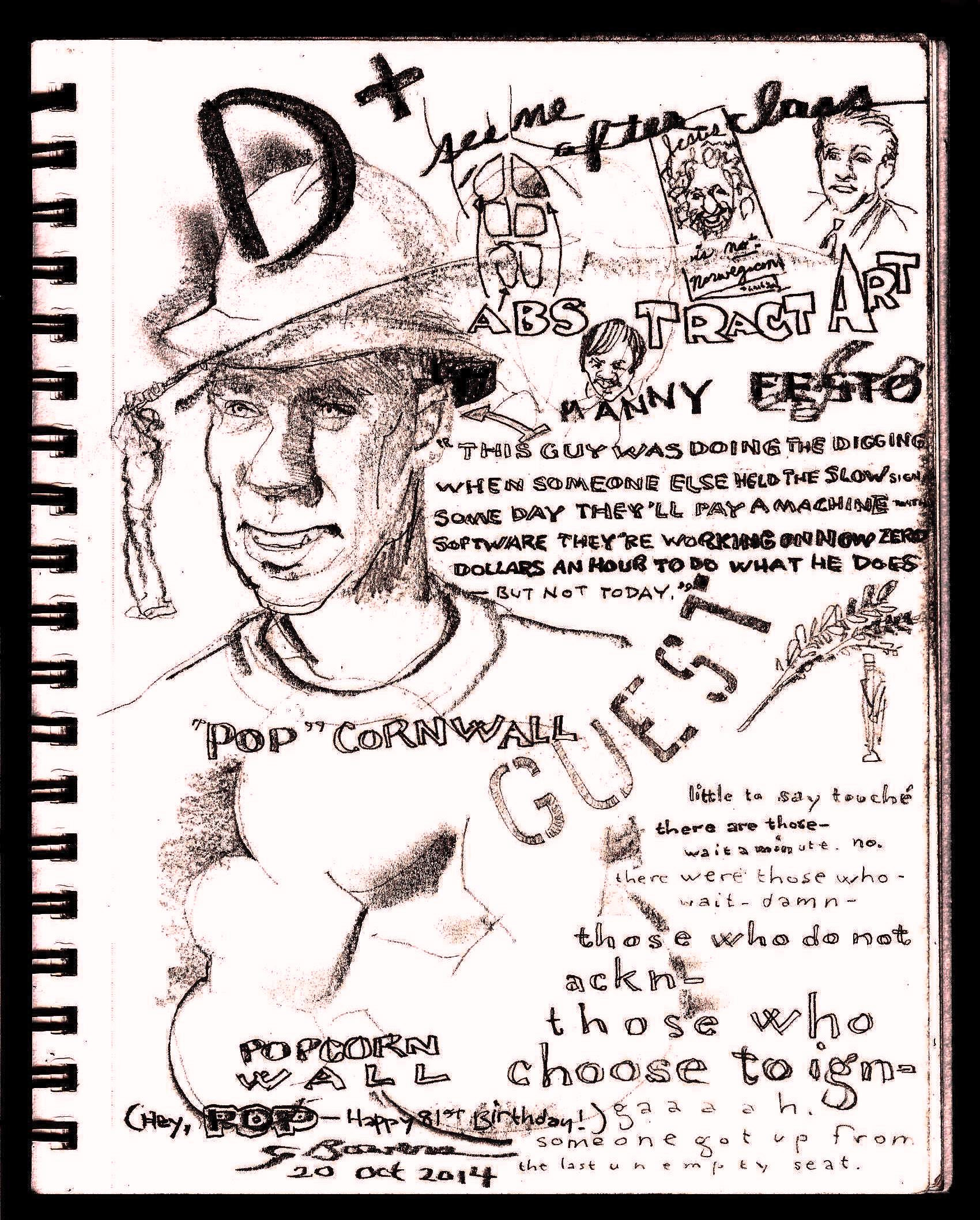 Here is a page that has been unfinished, hanging fire, for more than half a year. I would look at it over and over again and despair that it would forever be unfinished. It needed more pop–“Pop” Cornwall and POPcorn Wall were not enough. Finally today, October 20, 2014, rolled around. Today is what would have been my father’s 81st Birthday, were he still among us. At last–more Pop! (I never called him “Pop,” though. It was always “Dad” or “My Old Man.” And if you ever want a good cry, go to YouTube and find John Prine, or even better, the original songwriter Steve Goodman, singing “My Old Man.” I’m going to do it right after I post this.)