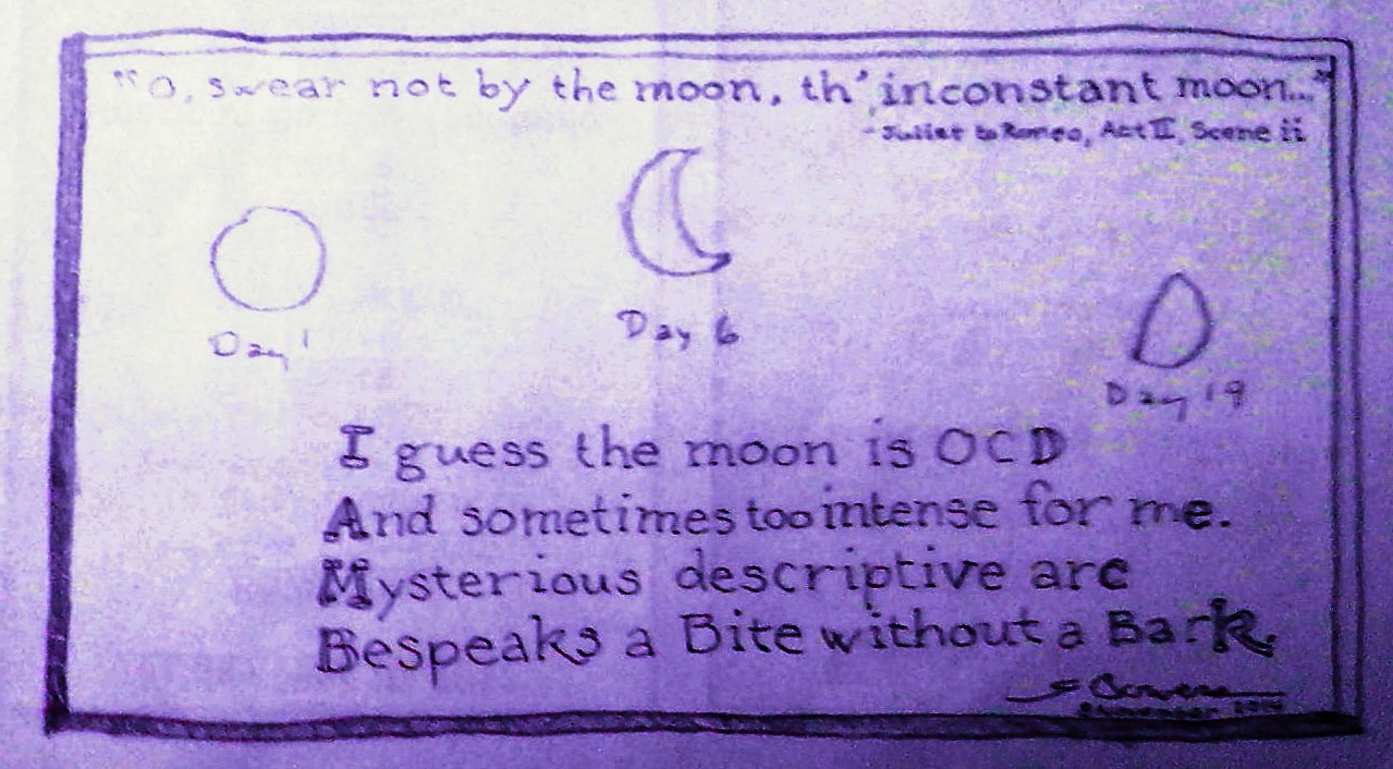 Then there’s a minimalist drawing of three phases of the moon which, viewed as a Gestalt, with a little artistic license granted, spell OCD (Obsessive-Compulsive Disorder).