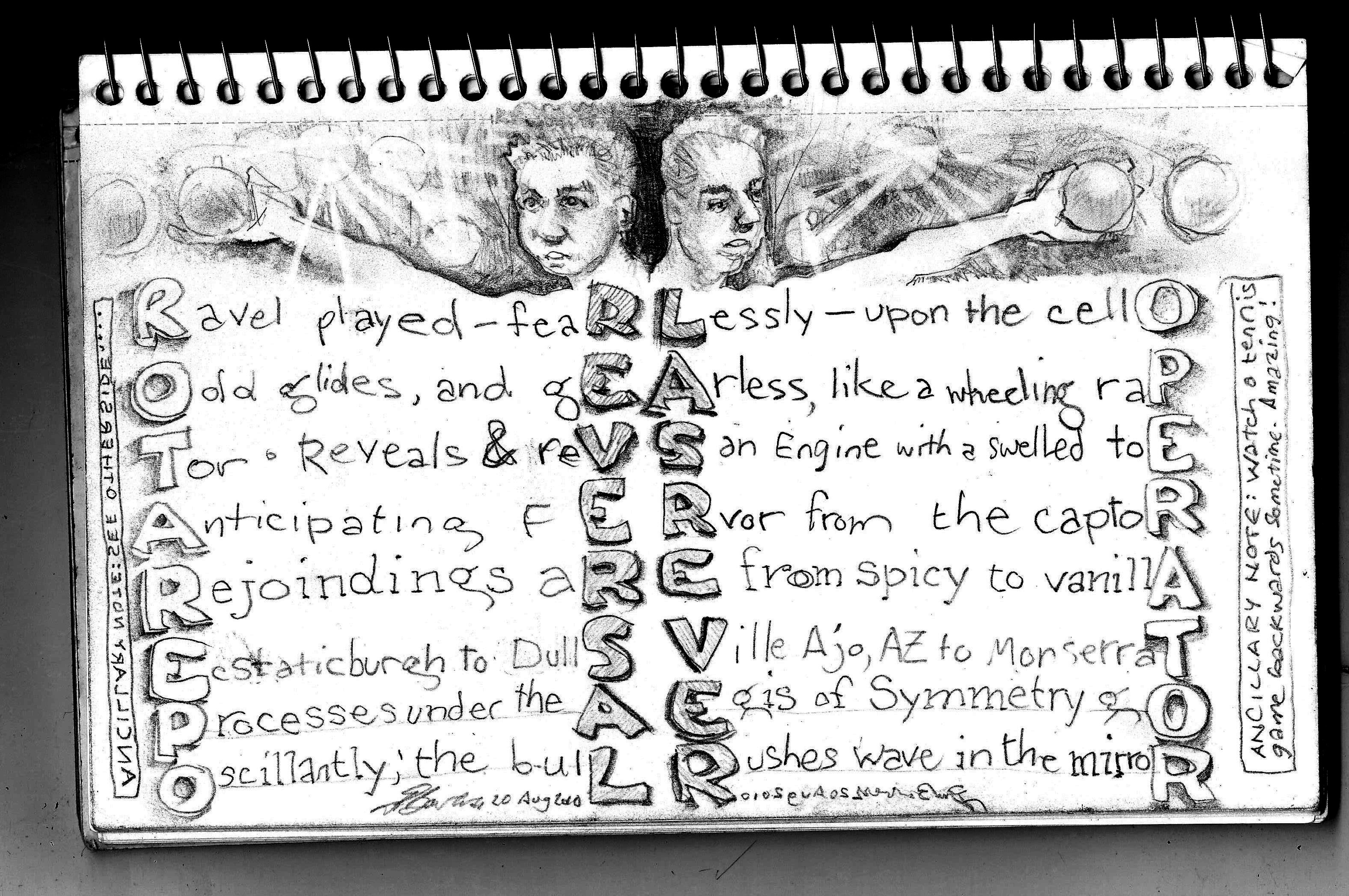 Yesterday’s post included a page in progress, the double acrostic for which is “Reversals Rehearsal.” By sheer happenstance I put the page in a notepad from four years ago, and found to my amused startlement that back in August of 2010 I’d also done a reversal-oriented acrostic, “Rotarepo Reversal Lasrever Operator.” Here they are together, first the Then page and then the Just-Now (I finished “Reversals Rehearsal” less than three hours ago).