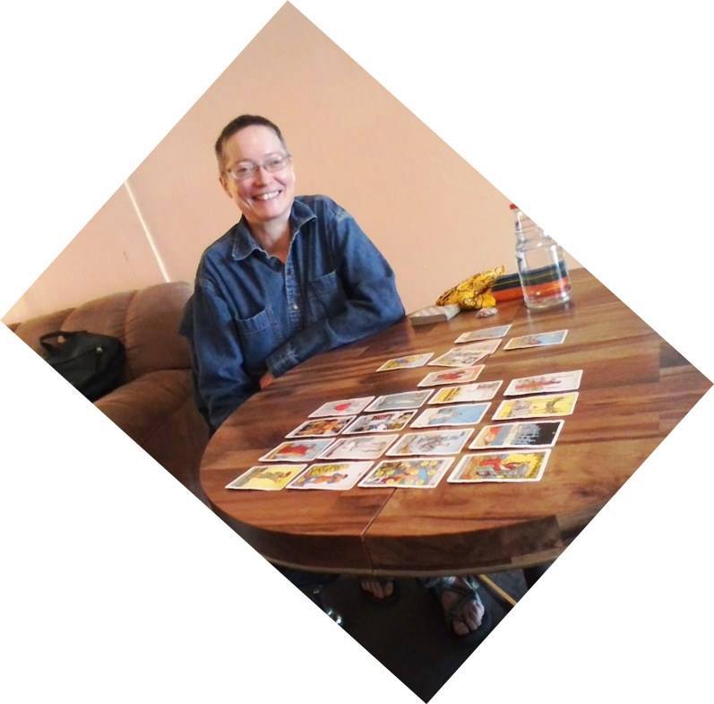 . . . and in the bookstore, up on a little platform, was a table and chairs and a sign offering Tarot Card readings. I sat in one of the chairs. Denise went elsewhere in the bookstore. Soon a woman arrived, beatific smile, close-cropped hair with a bit of gray on the sides, and introduced herself: Stone Constance Veritas. Solidity Everlastingness Truth–what a name!