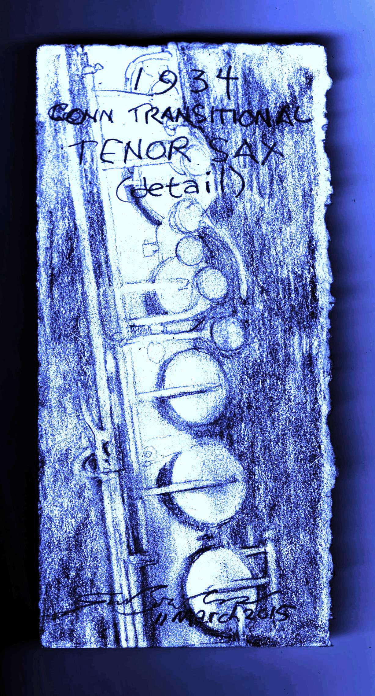 Here is a two-hour drawing that demonstrates how pitifully inadequate two hours can be when attempting true-blue illustration. But mission accomplished: the artist learned more about the intricacies of the tenor saxophone. The next ones will be better.