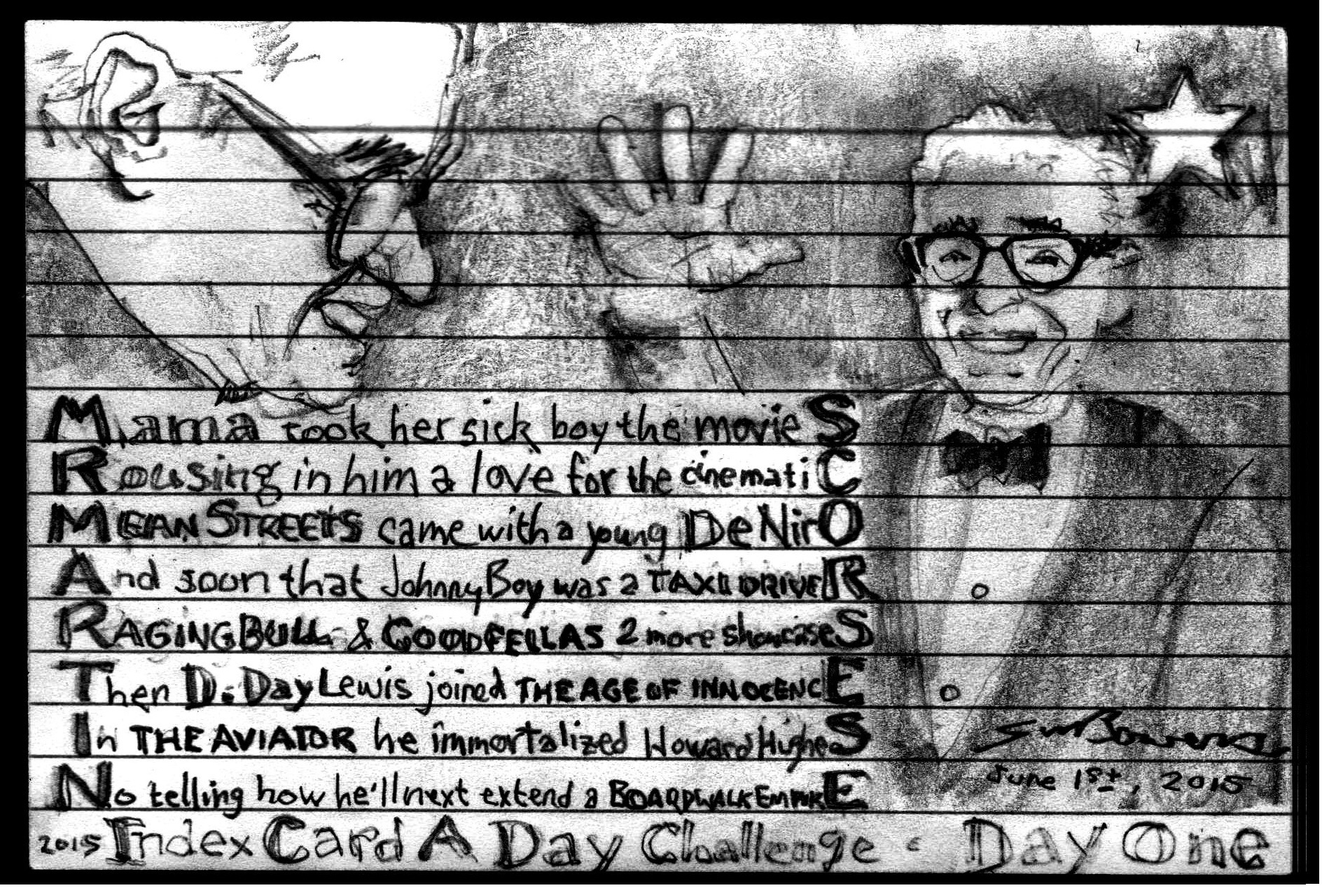 Today I begin my involvement with the 2015 Index Card A Day Challenge with an appreciation of Martin Scorsese, one of the finest moviemakers of all time, 72 years old and just getting started. I wish I had done a Scorsese page while Roger Ebert was still alive; I could have sent it to him and hoped for a reaction. Roger idolized Scorsese and wrote a book about him. Alas, I waited too long…
