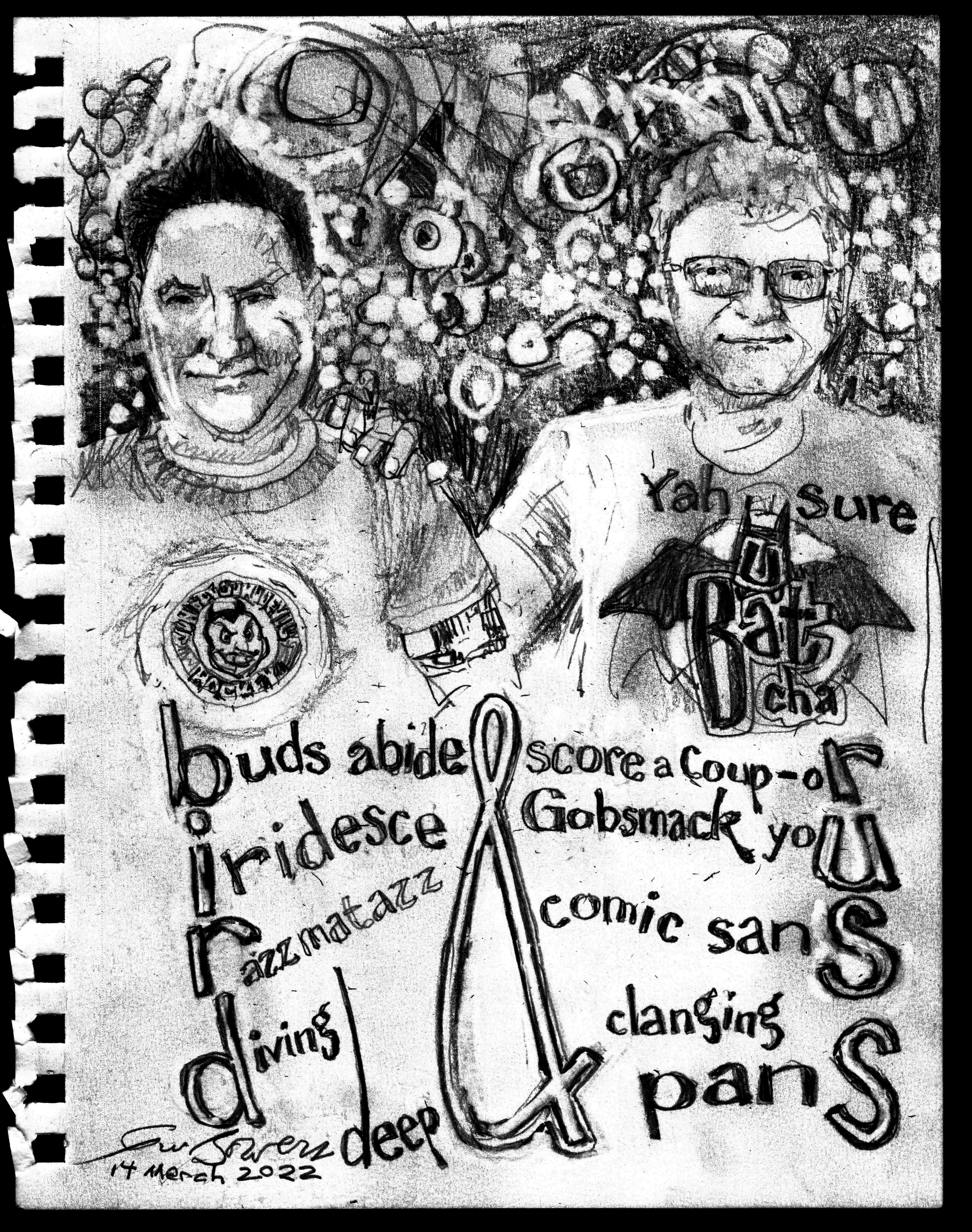 We were. We did. And it was a fine morning to hang and draw. And when I got home I took a look at one of the pics I’d taken of Birdie and Russ, and then drew some more.