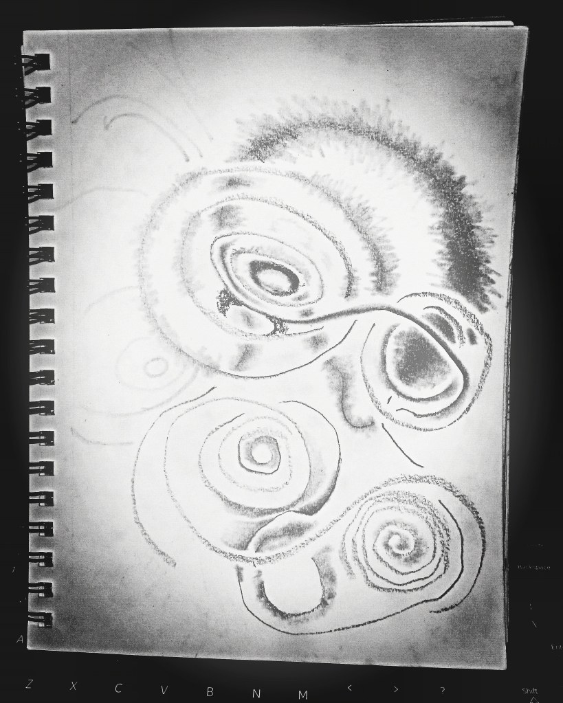 Minutes later, my music-loving, fellow 2D artist friend Myra Smith responded: “I thought inner workings of a human ear,” and my instant, flip response was “Huh?” But even as I was being a smart-aleck, that potent phrase “inner workings” resonated, echoing between my human ears. I loved it as a title. And I loved it as a quick, Cut The Gordian Knot solution to the work in progress: superimpose a face on this swirly stuff, tweak the drawing a little, and call it a day.