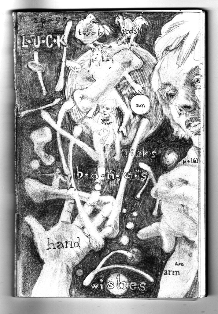 Here is a drawing I’ve been working on and off on for several days. It started as a study of chicken bones, and then the wishbones seemed to want to talk to each other and the Universe, so element by element the drawing came to stochastic life. It told me to have implied stories here and there, and I did my best to oblige. The last thing it told me was to sign it and stop, and think of it kindly as a possible future painting. It feels unfinished-yet-not, as if “in medias res” is essential to its being. If I do make a painting of it the strategy will be alla prima in bluish violet–maybe.