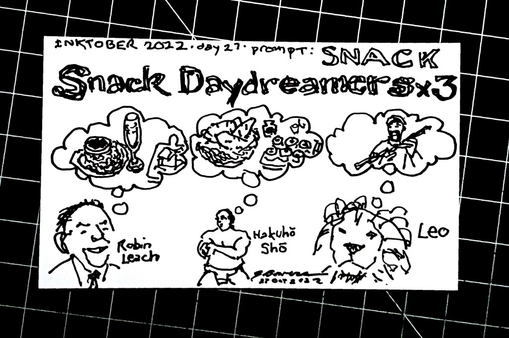 This is the soul of slapstick: a chain of ever-worsening events leading to exciting disaster. My drawing style, barely coherent, is slapstickily chaotic as well. So this text serves as libretto (Italian. Literally “little book” but “cheat sheet” is a more apt translation) to the scribbly operetta above.