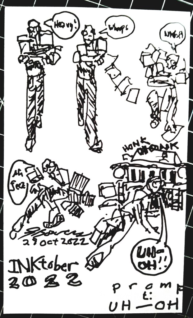 1) Guy walking with armload of books, papers, packages says “Heavy!” 2) A paper slips out and drifts to ground. Guy: “Whoops” 3) Guy reaches down with one hand for the paper. As he says “Nngh” with exertion, the unstable stack starts to topple. 4) Guy topples too and says “Ah Jeez” 5) Guy starts to pick himself up and turns and sees a large vehicle barreling toward him. Uh-Oh!!!
