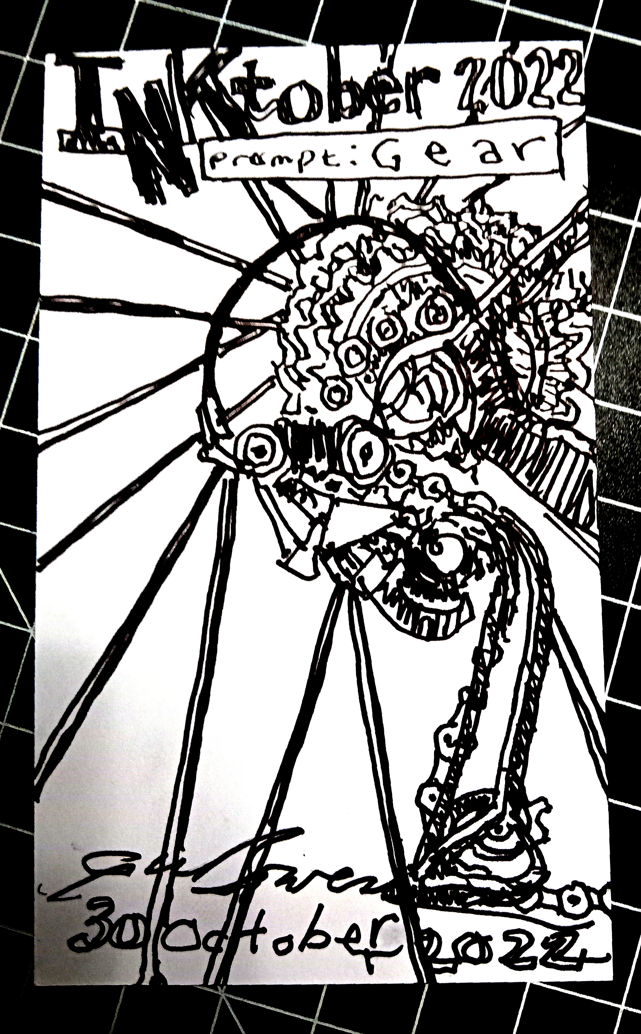 Being a city kid, I don’t have much of a feel for farms, so I did a search on aerial photos of farms and faked up the phony-baloney farm above. Sorry to report that my enthusiasm for Inktober has waned and I’m glad that this one gets it over with for now.