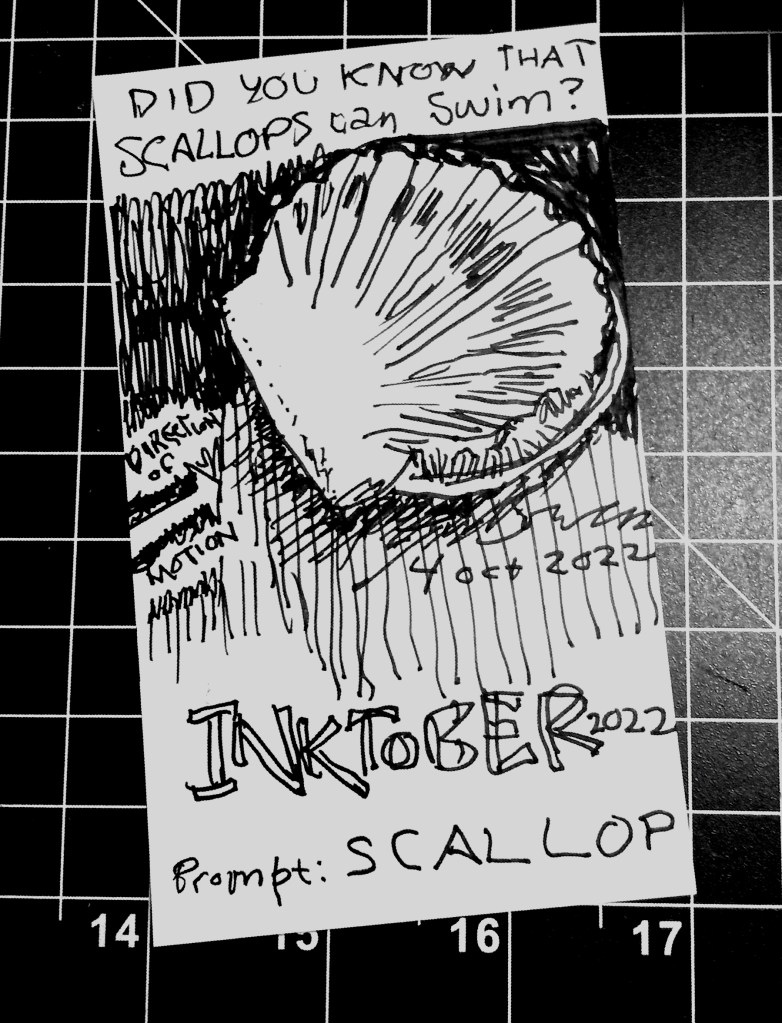 October 4, 2022Uncategorized Leave a comment Inktober 2022, day 4: Scallop There are lots of videos of swimming scallops. They are sort of bouncy. Share this: Click to share on X (Opens in new window) X Click to share on Facebook (Opens in new window) Facebook Like Loading... Related adductor muscleartGary BowersInktoberInktober 2022Scallop