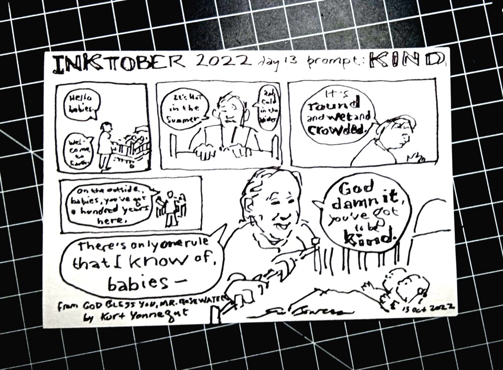 Today’s prompt, “Kind,” brought to mind one of my favorite scenes from Kurt Vonnegut’s magic/real God Bless You, Mr. Rosewater. Eliot Rosewater, head of the Rosewater Foundation and active alcoholic, is so revered by the denizens of Rosewater, Indiana that a new mom has asked him to baptize her newborn twins. So Eliot is imagining what he will say to them, and he comes up with this: “Hello babies. Welcome to Earth. It’s hot in the summer and cold in the winter. It’s round and wet and crowded. On the outside, babies, you’ve got a hundred years here. There’s only one rule that I know of, babies–God damn it, you’ve got to be kind.”