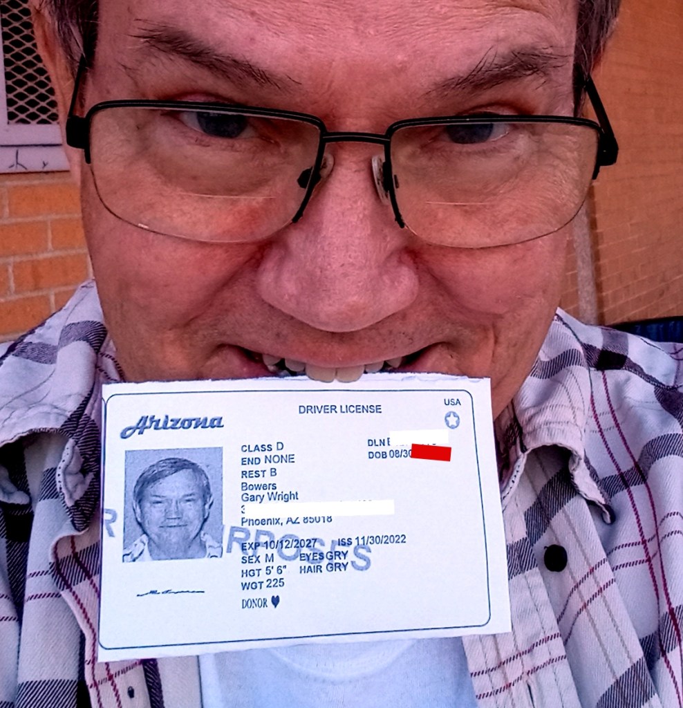 Here’s a tale of Whoa. (Thanks for reading my latest Bad Pun.) On October 12 of this year I went to some lengths to upgrade my driver’s license to a State ID, which will sometime in 2023 be required for anyone who wants to travel. I brought with me the right kind of the copy of my birth certificate (has a seal from Vital Records), establishing that I was indeed born in the United States of America, and a lease agreement, establishing that I did indeed live where I said I lived. The lady at the booth scanned my documents, I signed a scanner for the signature line, they gave me an eye test and took my picture, and they told me I’d get my card “in about a week.”
